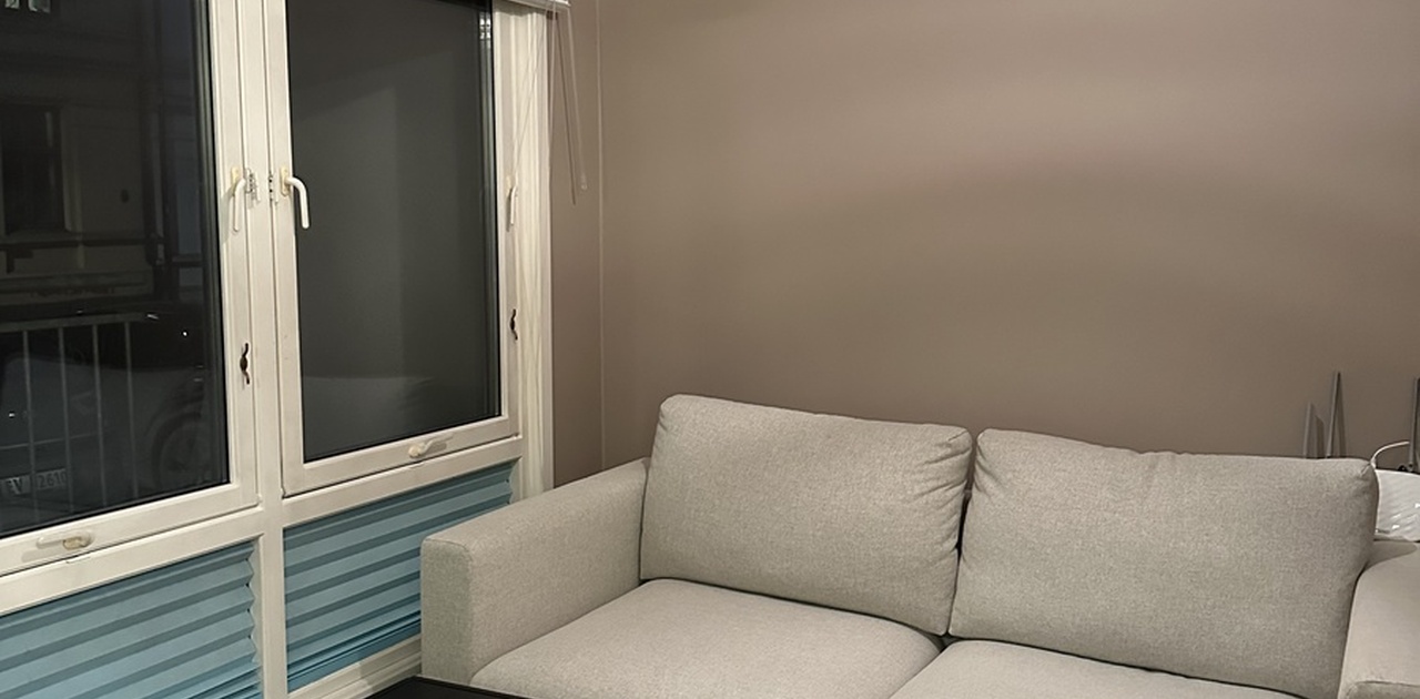 Leiligheten er praktisk møblert med ny 140 cm seng, sofakrok og spisebord med stoler. Store vinduer og gode lysforhold.