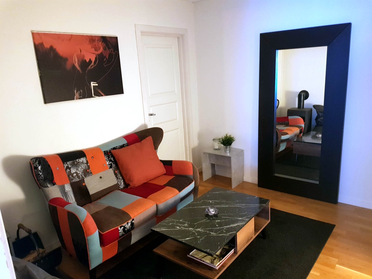 Leiligheten er lys og trivelig i to etasjer, med to separate toalett og et stort bad m/vaskemaskin og tørketrommel. Stuen har felles TV.