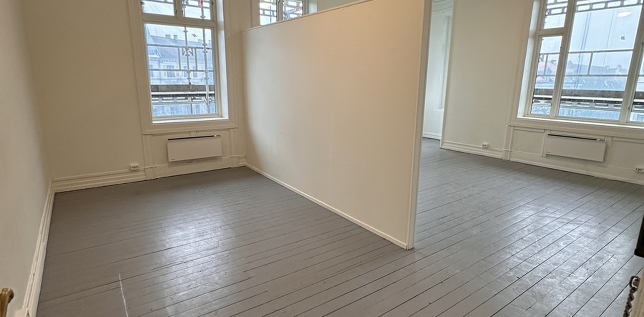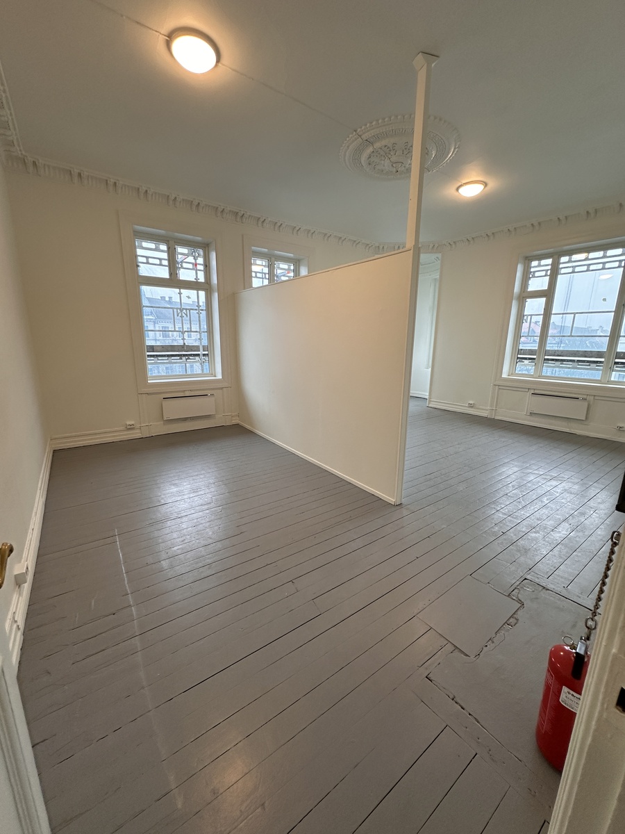 Stor hybel på 40 m2 som innehar 4 vinduer, 1 karnappvindu og en lettvegg som lett kan innredes som et soverom.