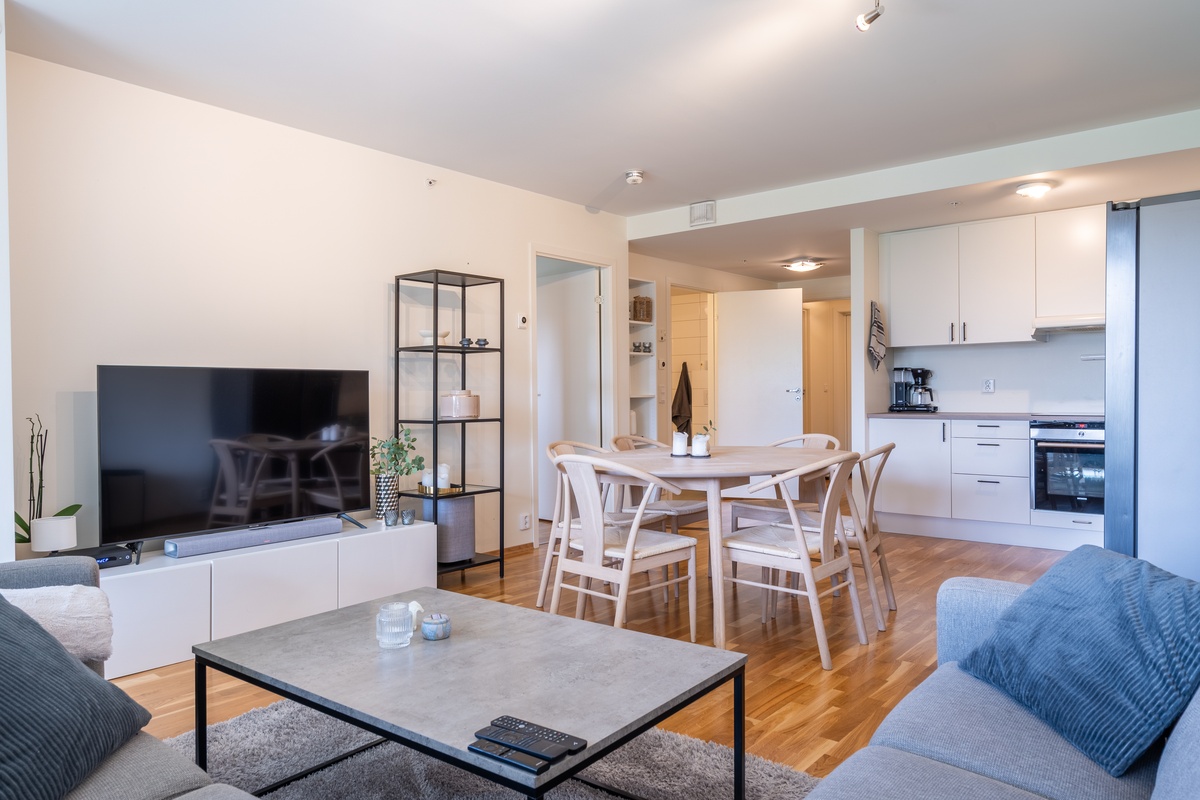 Lys, attraktiv og moderne leilighet med god standard og fine kvaliteter. Det er parkett på alle gulv, bortsett fra baderommet som er helfliset. Leiligheten har en praktisk løsning kombinert med god takhøyde og store vinduer, som gir en romslig følelse og godt med lys inn i leiligheten.