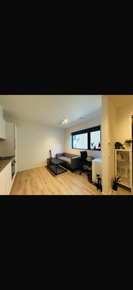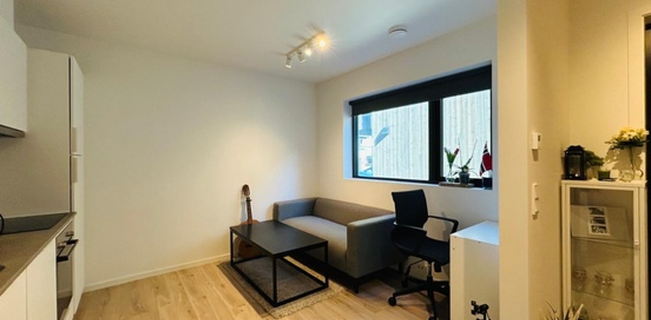 Hybelen har høy standard og lyst interiør. Den inkluderer integrerte hvitevarer og mulighet for delvis møblering etter avtale (sofa, stuebord, seng).