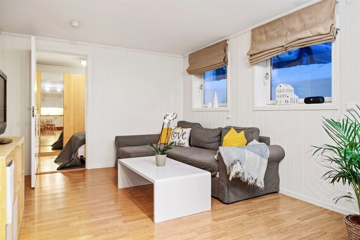 Leies ut delvis møblert (seng, sofa, spisebord med stoler, garderobeskap). Eget vaskerom med vaskemaskin og tørketrommel. Møblene avviker fra bildene.