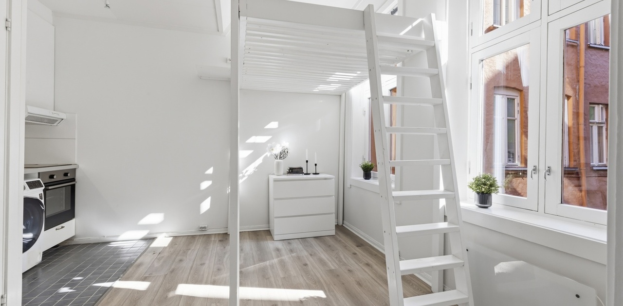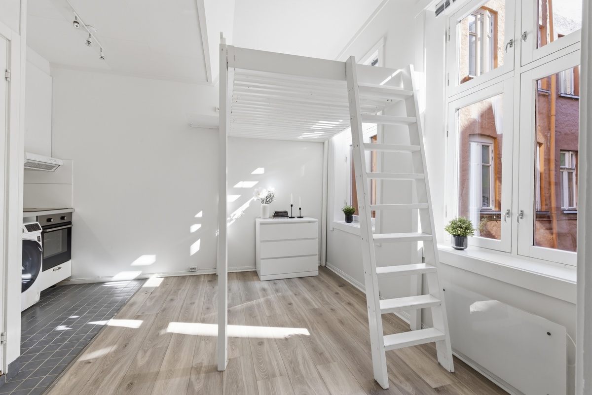 Det er meget god takhøyde. Sengen står ca 190 cm over gulvet, med flyttbar trapp opp. Dette gir svært god og fleksibel plassutnyttelse i boligen.