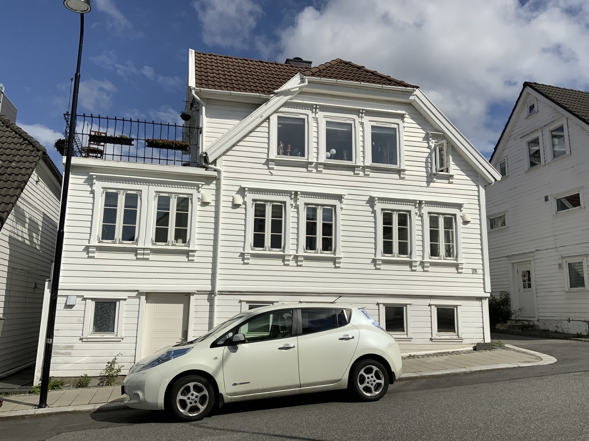 Leilighet til leie i et lite hvitmalt trehus i Stavanger sentrum, med romslig takterrasse med fjordutsikt og måkeskrik.