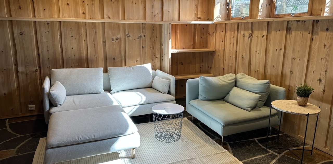 Stor stue - Vannbåren varme i gulv. Lun og trivelig med peis som kan benyttes.