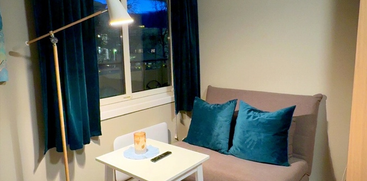 Møblert studio med eget bad med vaskemaskin og tørkestativ, samt hybelkjøkken med Micro 3 i 1(Micro, airfryer og grill) samt annet utstyr(kopper, fat, bestikk, kasseroller, stekepanne etc). Kan være også være utstyrt med håndklær, sengetrekk/dyne/pute. Fredelig, men sentralt område med hyppige bussavganger både til sentrum og mot UNN/UiT. Ingen røyk eller fest. Deler entre med hovedleilighet. Bildene kan avvike litt fra hvilke møbler som er på hybelen nå.