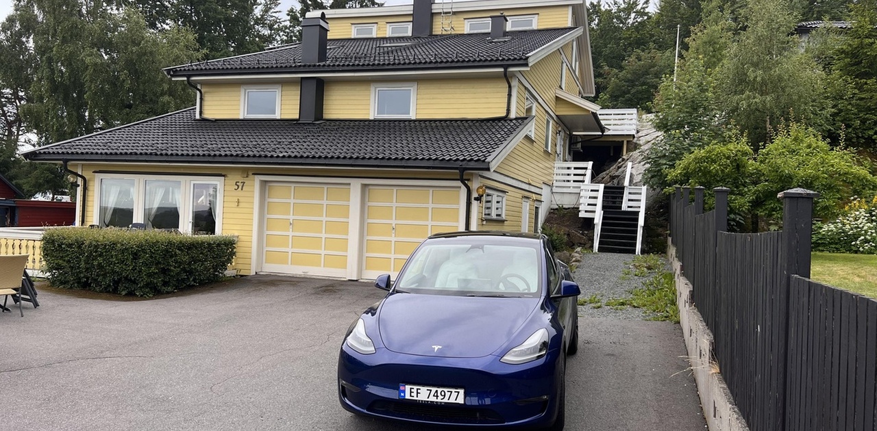over sjøen og deler av Larvik. Foran garasjen finner man en asfaltert gårdsplass