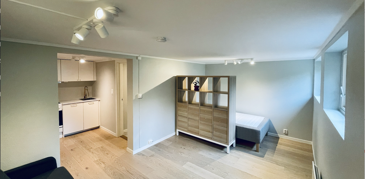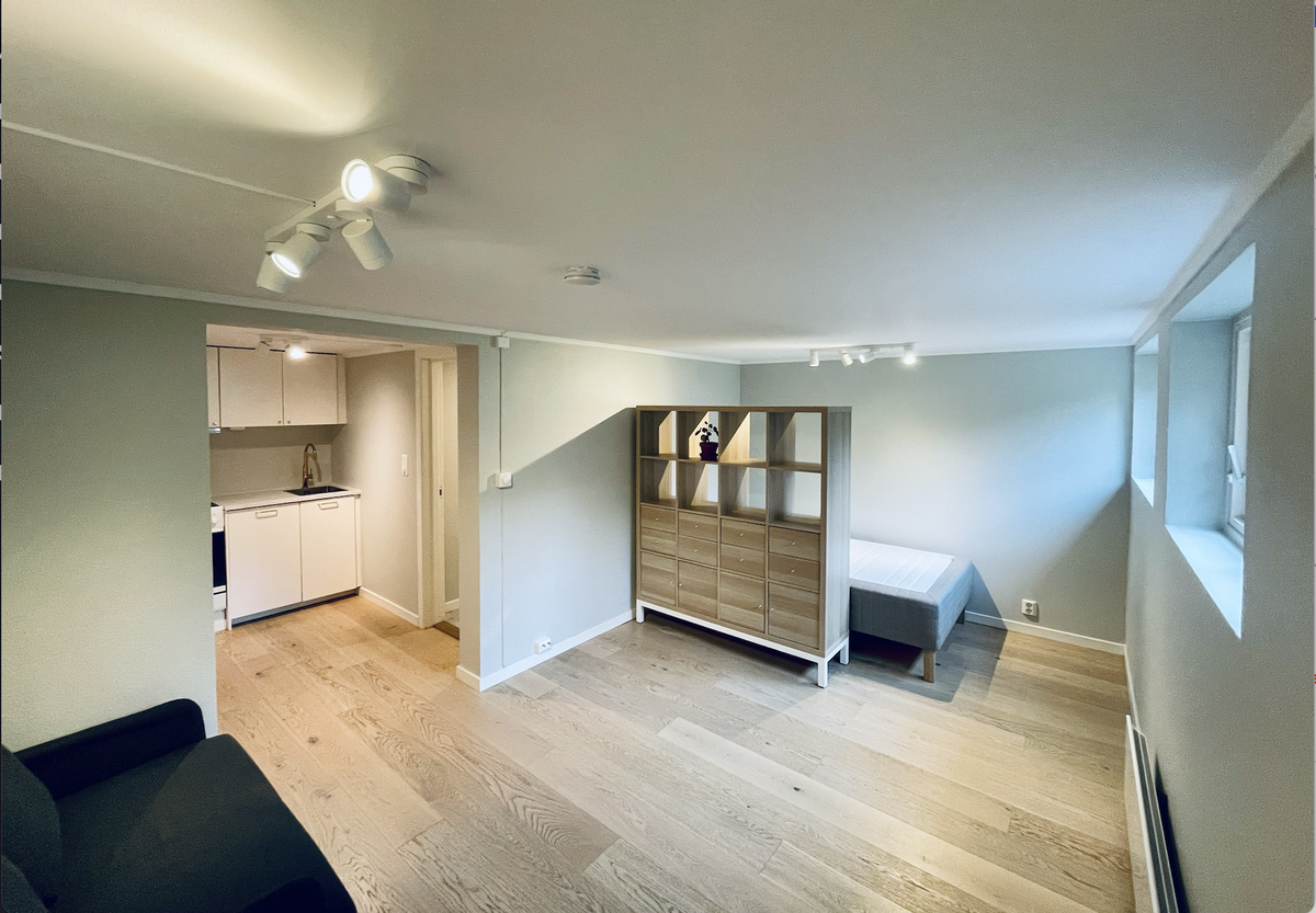 Moderne ett- roms hybel i underetasjen av enebolig leies ut, hybelen ligger sentralt på Jar og inneholder stue og sov i ett, separat kjøkkenkrok, bad og gang.