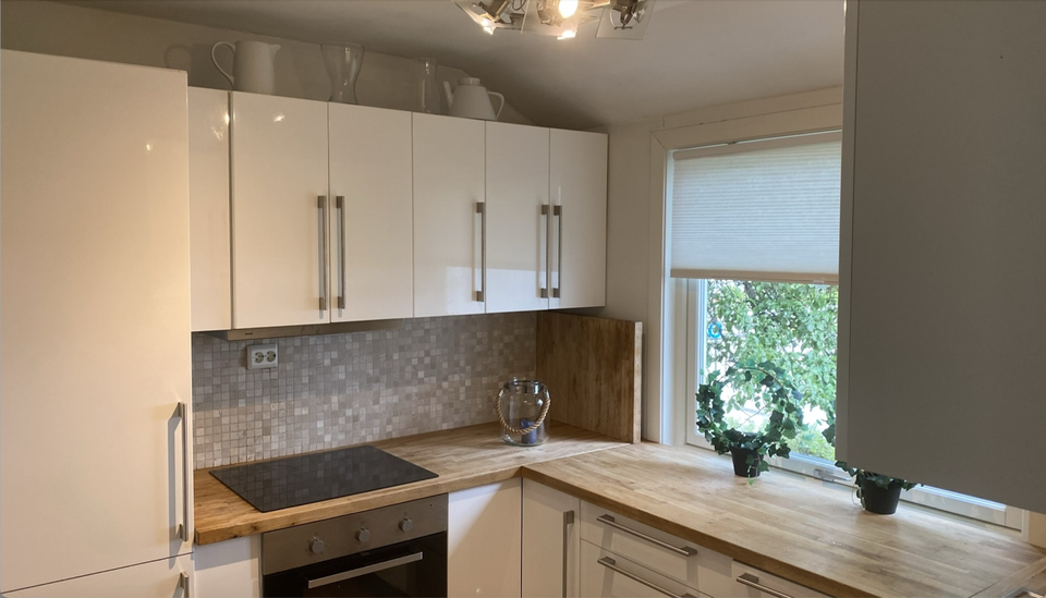 - Kjøkken hvit høyglans med integrerte hvitevarer - kjøleskap med frys, komfyr induksjonstopp, oppvaskmaskin, heltre eik bankeplate.