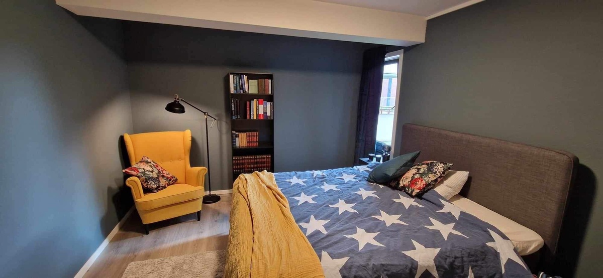Ditt rom kommer også ferdig møblert med seng, lenestol, bokhylle og et stort klesskap, og god plass til skrivebord.