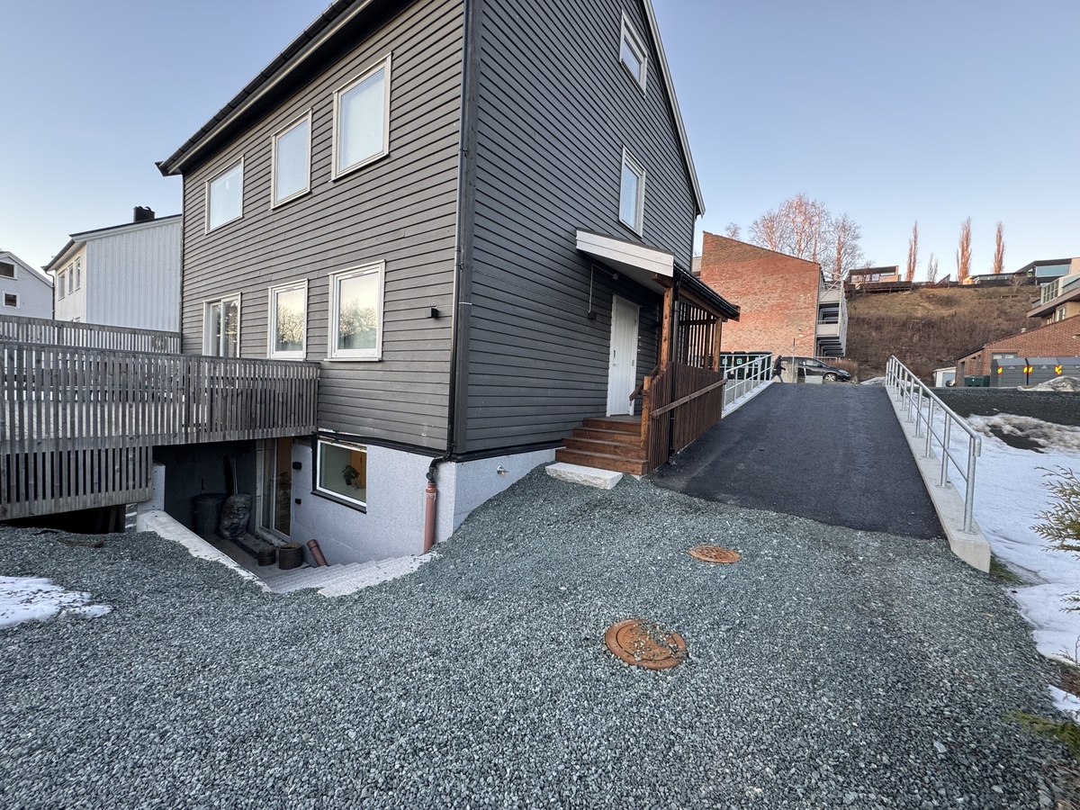 Leiligheten har fire romslige soverom, et stilrent bad og en åpen stue/kjøkkenløsning med moderne innredning. Den har egen inngang og tilgang til en felles bod i garasjen, hvor det også er mulighet for sykkelparkering. For ekstra komfort er alle soverommene utstyrt med lydisolerte dører.