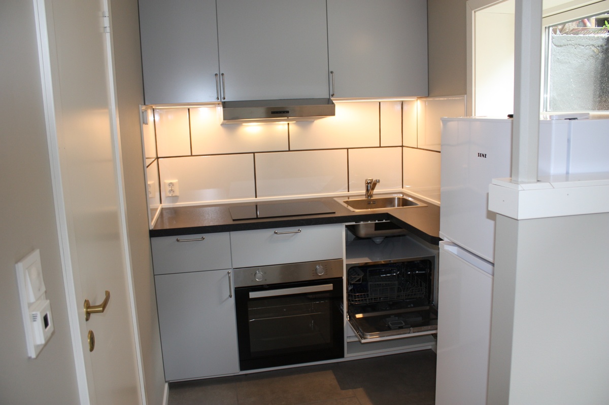 Sokkelleiligheten er relativt nyoppusset (2023) og har en effektiv planløsning som gjør at den kommer med både vaskemaskin og oppvaskemaskin på relativt liten plass. Det er ikke eget soverom men en avskilt sove-alkove løsning.