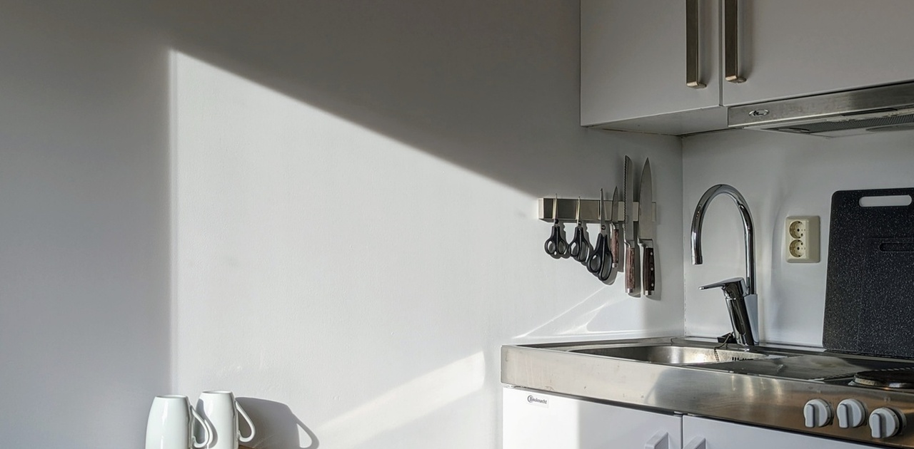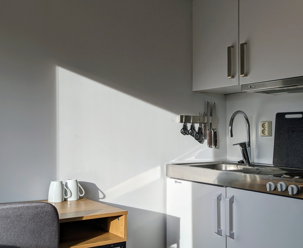 Hybelen disponerer også et vaskerom og et ekstra kjøkken som man deler med de andre hyblene i etasjen. Her har du en bakerovn og en større kjøkkenbenk når det trengs.