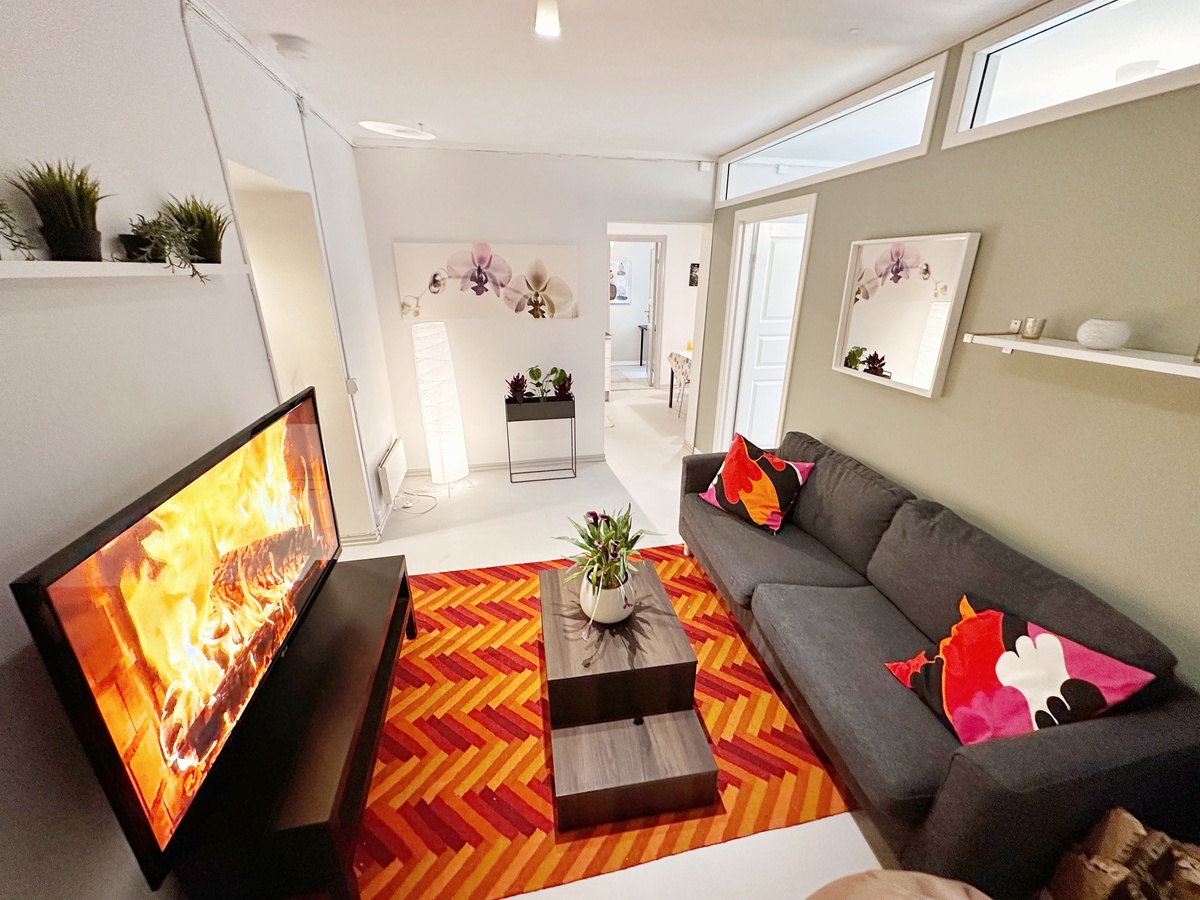 - Stue med sofa, bord, peis og tv m. chromecast.