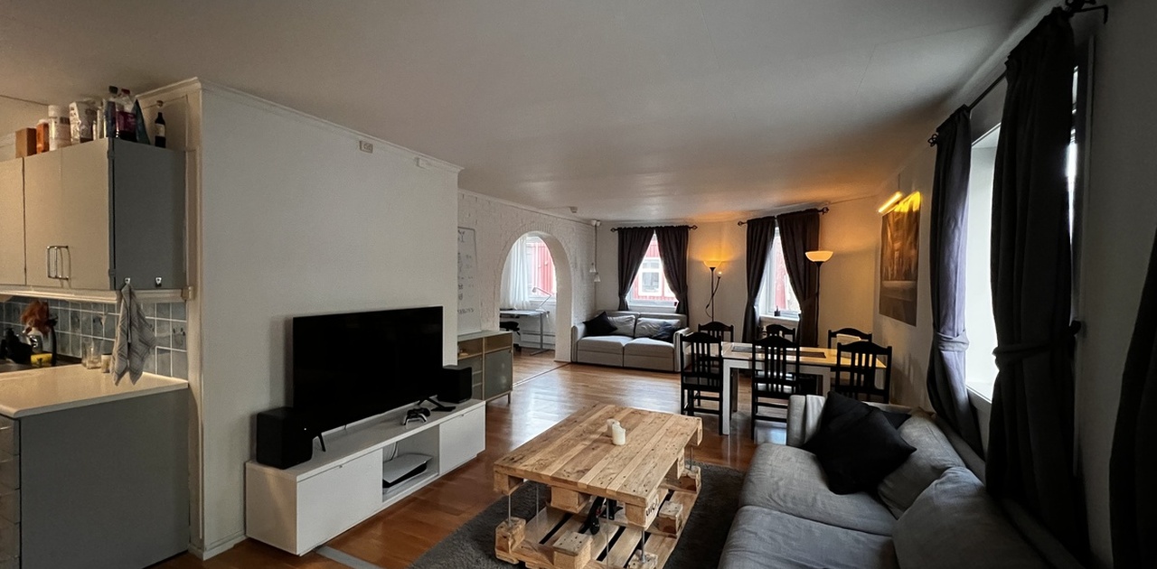 Dette er en romslig leilighet på 120 kvm med god plass og hyggelig atmosfære. Rommet som leies ut er på ca. 15 kvm, så du får god plass til både seng, skrivebord og oppbevaring. Beliggenheten er svært sentral, med kort avstand til Solsiden og flere dagligvarebutikker i nærheten.