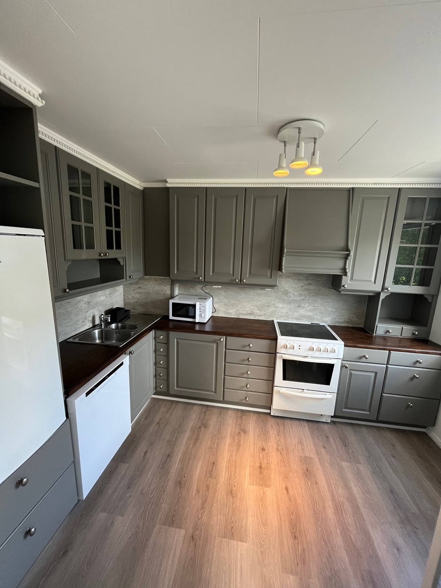 Boligen har en romslig stue med mye naturlig lys. Stuen er fullt møblert med blant annet sofa, tv og spisestue. Kjøkkenet har god oppbevaringsplass, og det er inkludert hvitevarer som kjøleskap, oppvaskmaskin og ovn. Det er også en koselig kjøkkenkrok der.