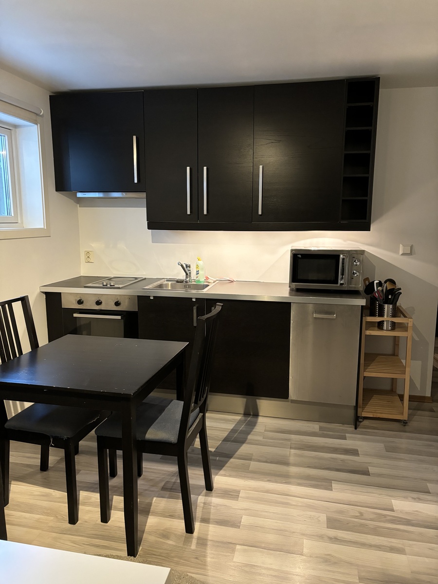Leiligheten er møblert med sofa, stuebord, kjøkkenbord med stoler, TV, vaskemaskin, seng og Garderobeskap