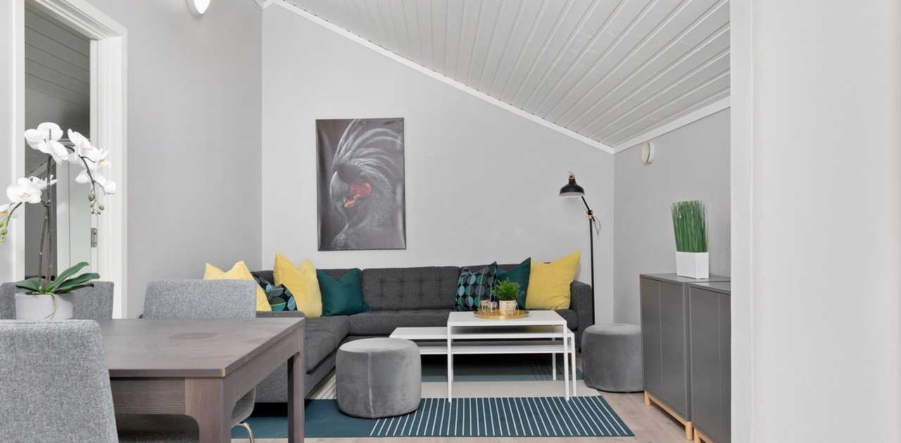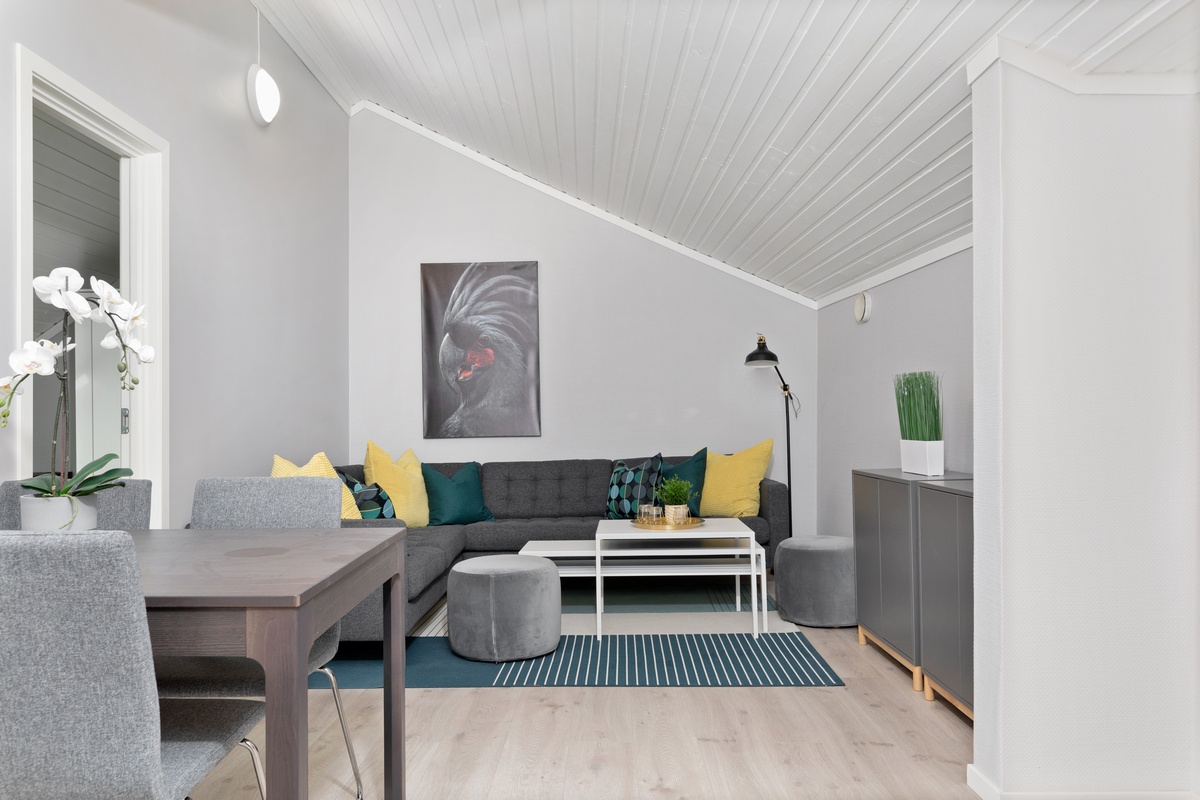 Stuen er møblert med sofa og sofabord, samt spisestue med spisebord og stoler. Kjøkkenet har godt med skapplass, samt oppvaskmaskin, komfyr og kombiskap.