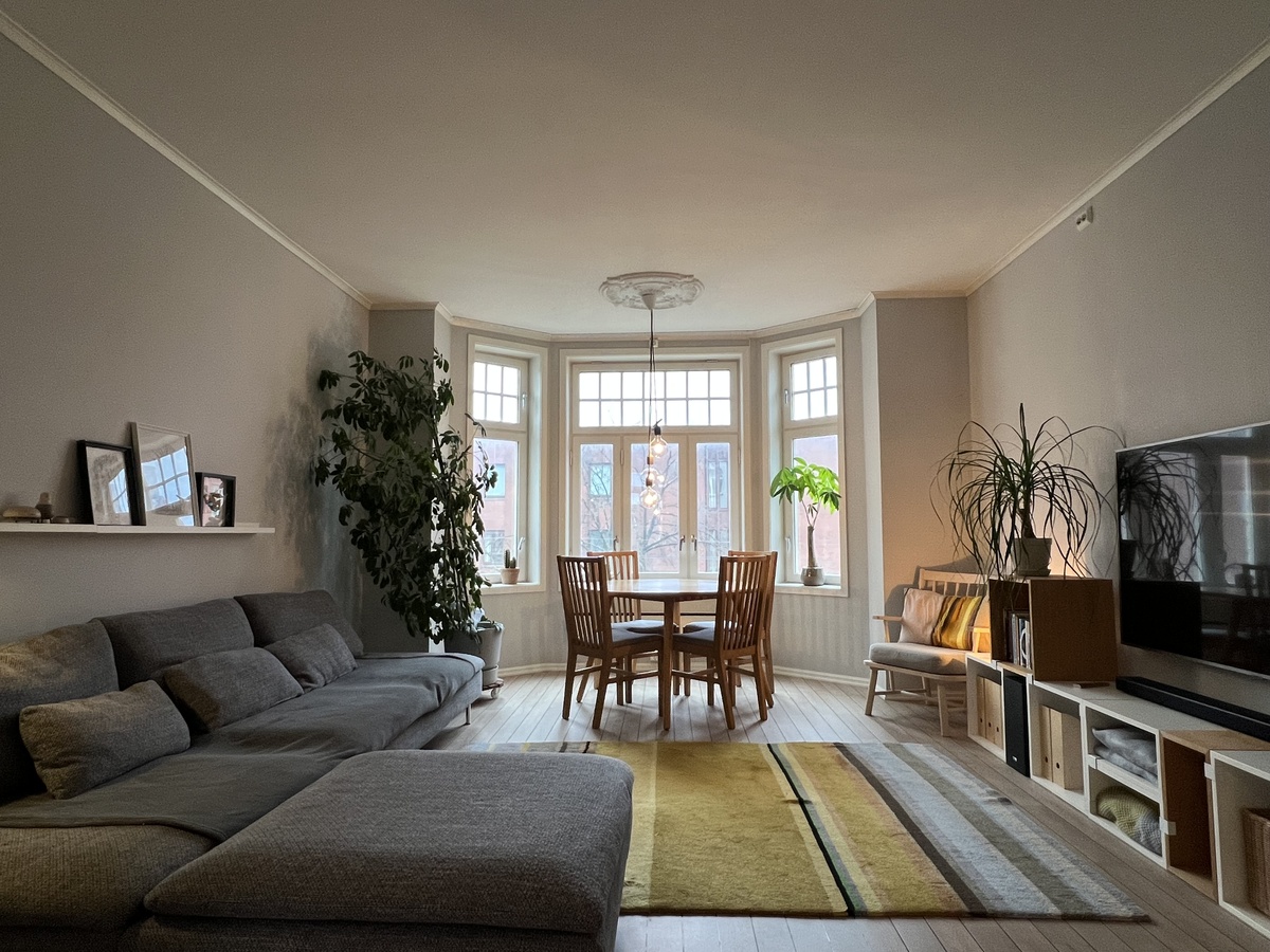 Koselig leilighet midt i sentrum. Leiligheten er på 68 kvadratmeter, har to soverom (8 og 12 kvadratmeter), stue, kjøkken, baderom og balkong.