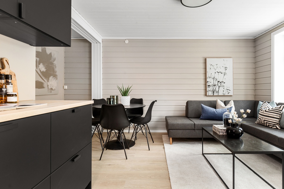 - Åpen stue-/kjøkkenløsning med sofa, sofabord, spisebord og spisestoler. Alt av hvitevarer og kjøkkenutstyr inkl.