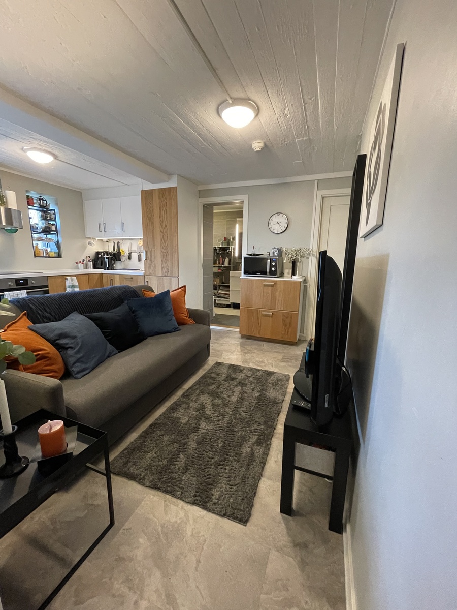 Leiligheten har to soverom, ett bad og kjøkken/stue kombinert i ett rom + en bod i gangen for lagring. Alle rom er møblert som på bildene, men det ledige rommet er umøblert - utenom et klesskap. Leiligheten ligger i et rolig bolig-område, med nydelig utsikt og kort vei til både turområder og busstopp. Det tar ca. 30 min å gå til sentrum, men kun 11 min med buss. Tenker også at det er viktig å påpeke at det er en relativt liten leilighet, som ikke egner seg for festing eller samlinger av store grupper.