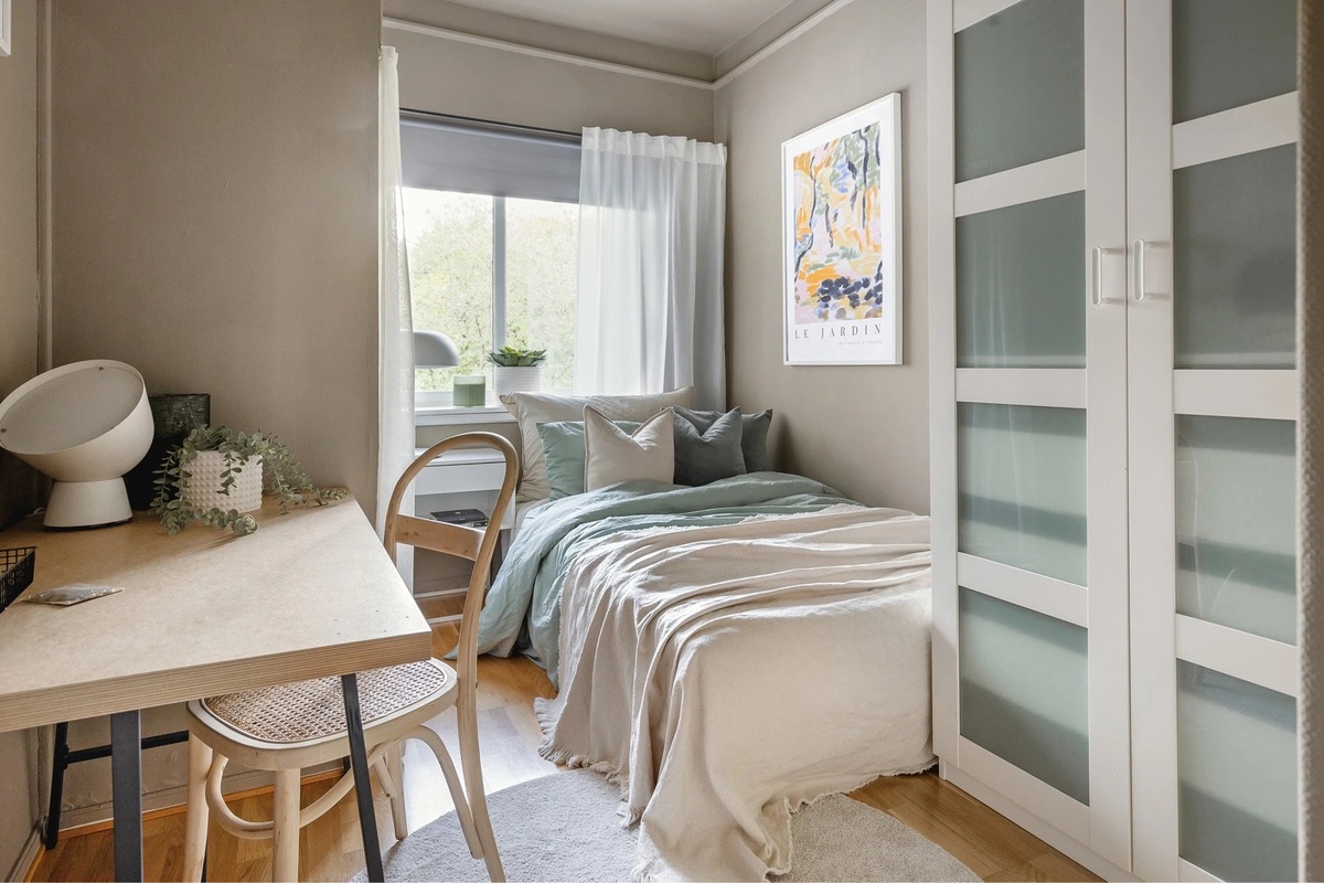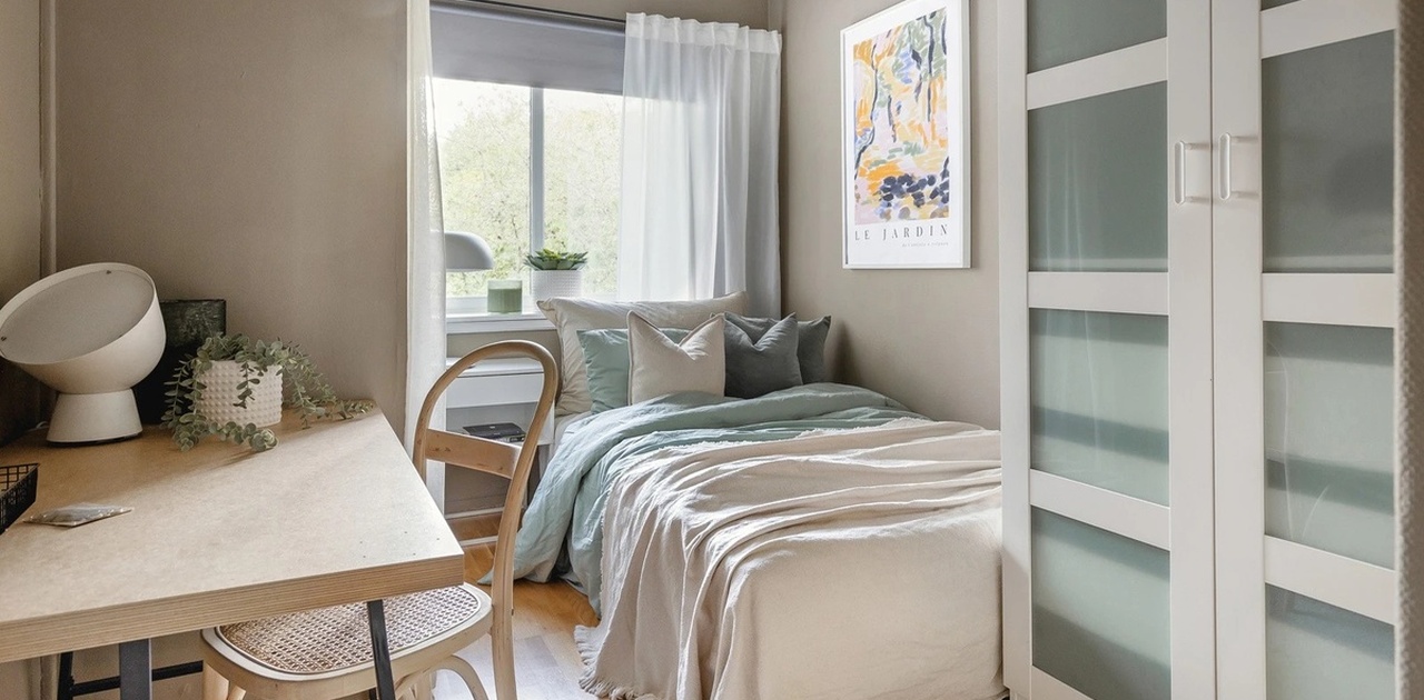 Soverommet har seng, pult, og en liten kommode/nattbord. Leiligheten har også et garderoberom der du har et stort skap.