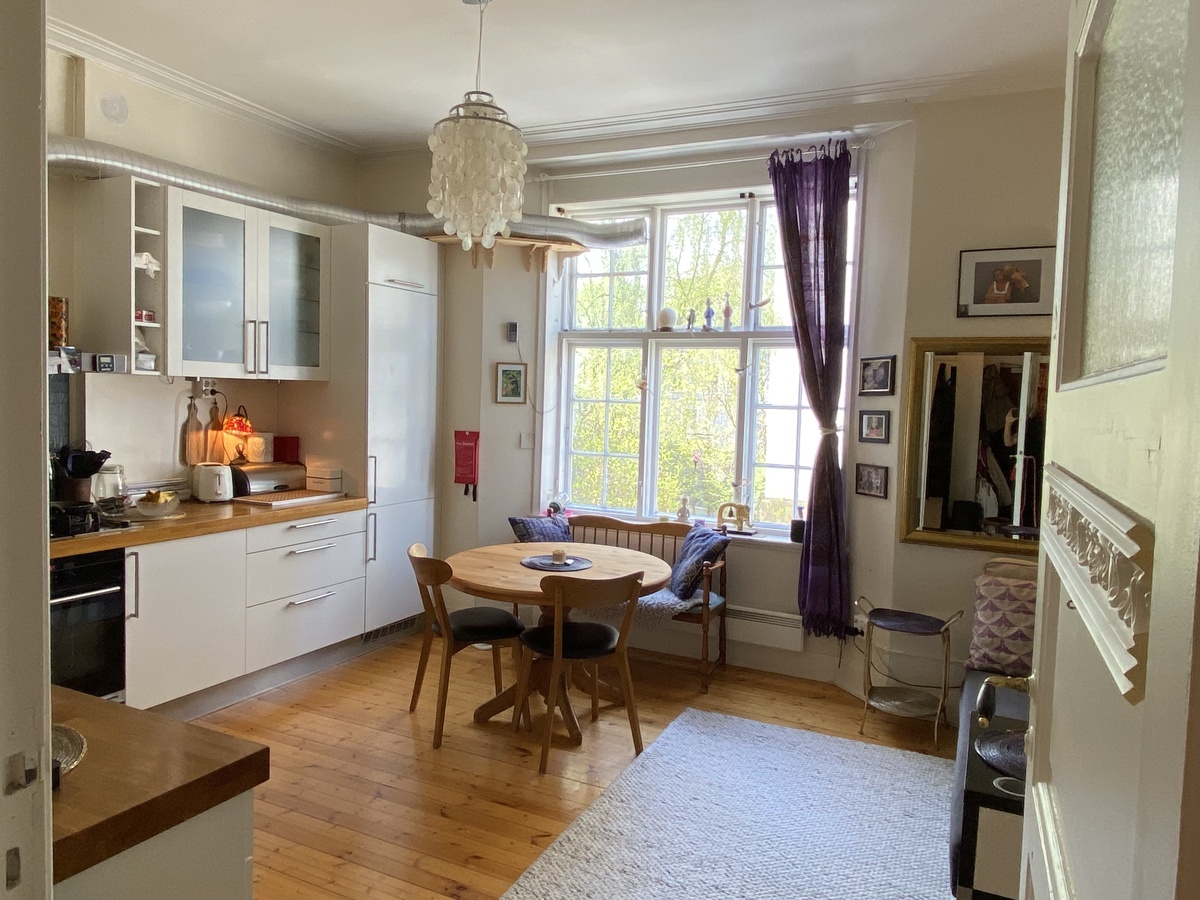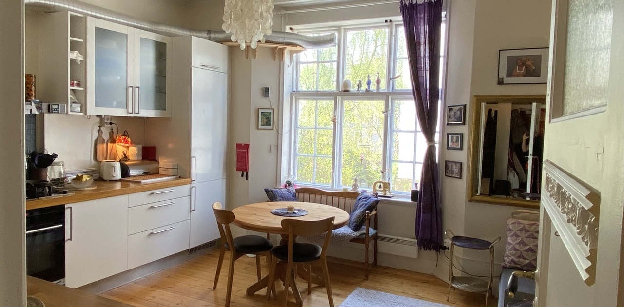 Vi leier ut et stort og hyggelig rom, med store vinduer og høyt under taket. Vi leier ut umøblert, men det er mulighet for å låne diverse møbler om ønskelig. Der er skap og skuffer med plass til klær og et stort utstyrt kjøkken med hvitevarer, komfyr og oppvaskmaskin.