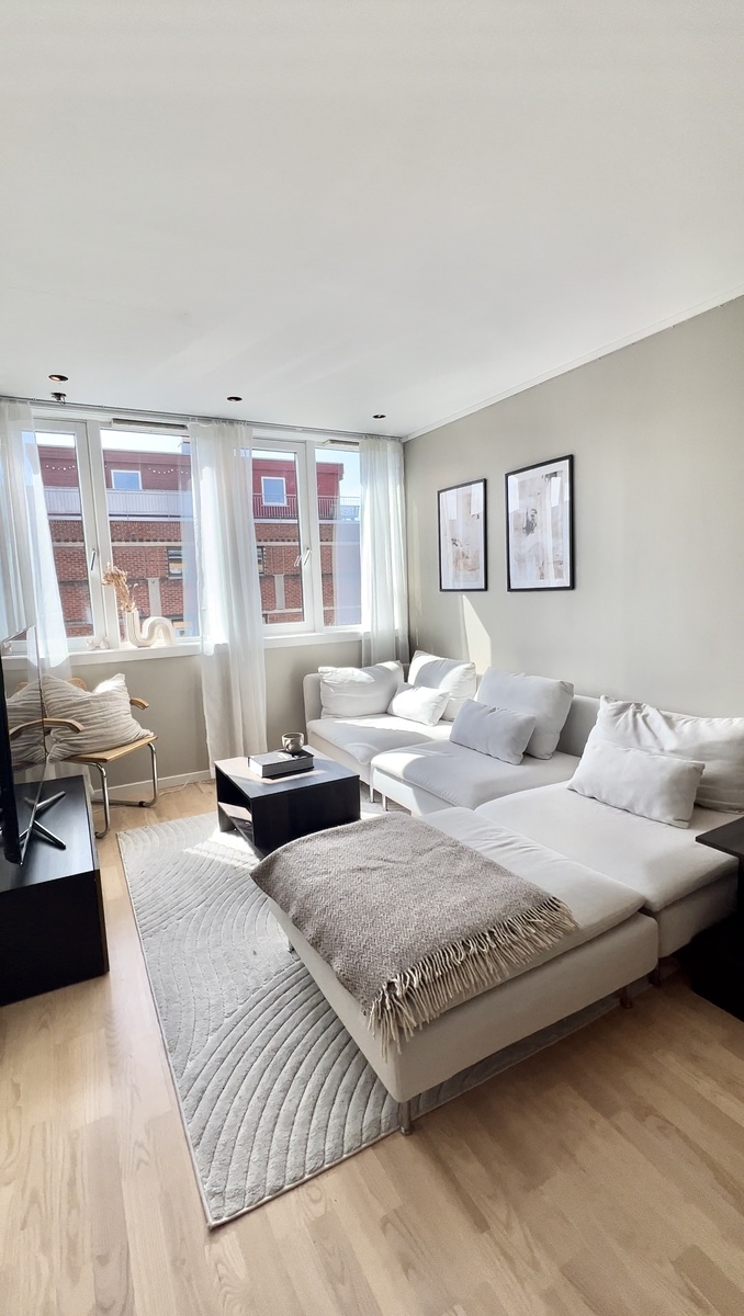 Leiligheten ligger i 4. etasje med heis, er delvis møblert, og du får også tilgang til en stor, felles takterrasse i 5. etasje ☀️