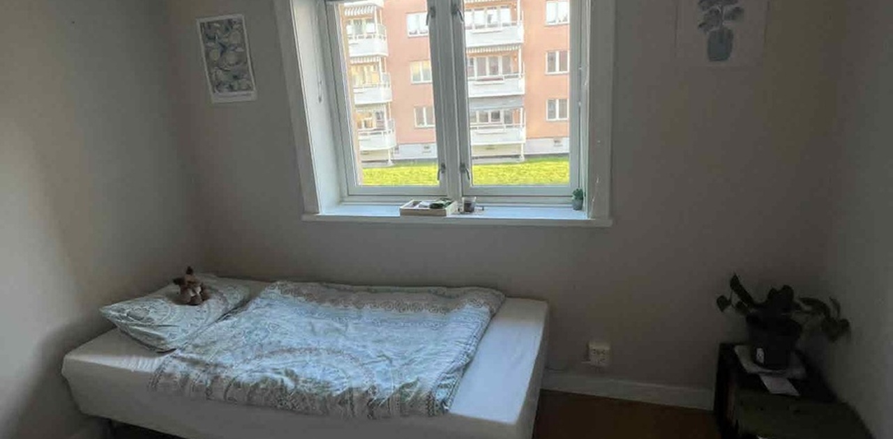 Leiligheten er 67 kvm med 2 soverom, 1 bad, kjøkken, stue og balkong. Rommet på 8 kvm som leies ut er møblert med seng og kommode som er avbildet. Resten av leiligheten er også møblert. Strøm kommer i tillegg.