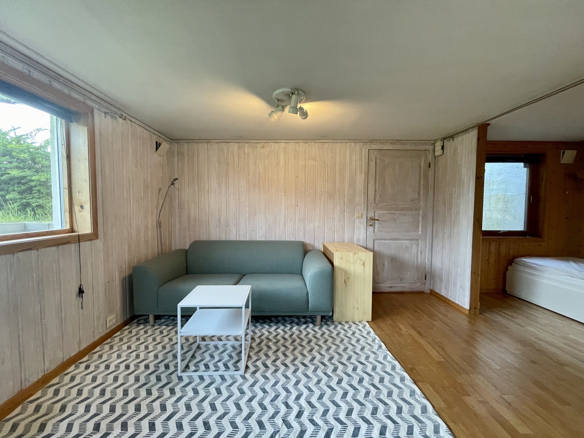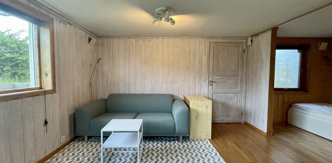 Hybelen har egen ytterdør på baksiden av huset, gang, stue/kjøkken, sovealkove, bad med kombinert vaskemaskin og tørketrommel, stort kombinert kjøleskap/fryser, komfyr og to store garderobeskap. Hybelen er møblert med sofa, spisebord, nattbord, to stoler, tv, teppe, seng 90 cm bred og madrass. Gardiner og kjøkkeninventar følger også med.