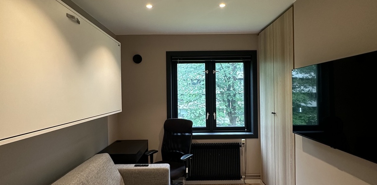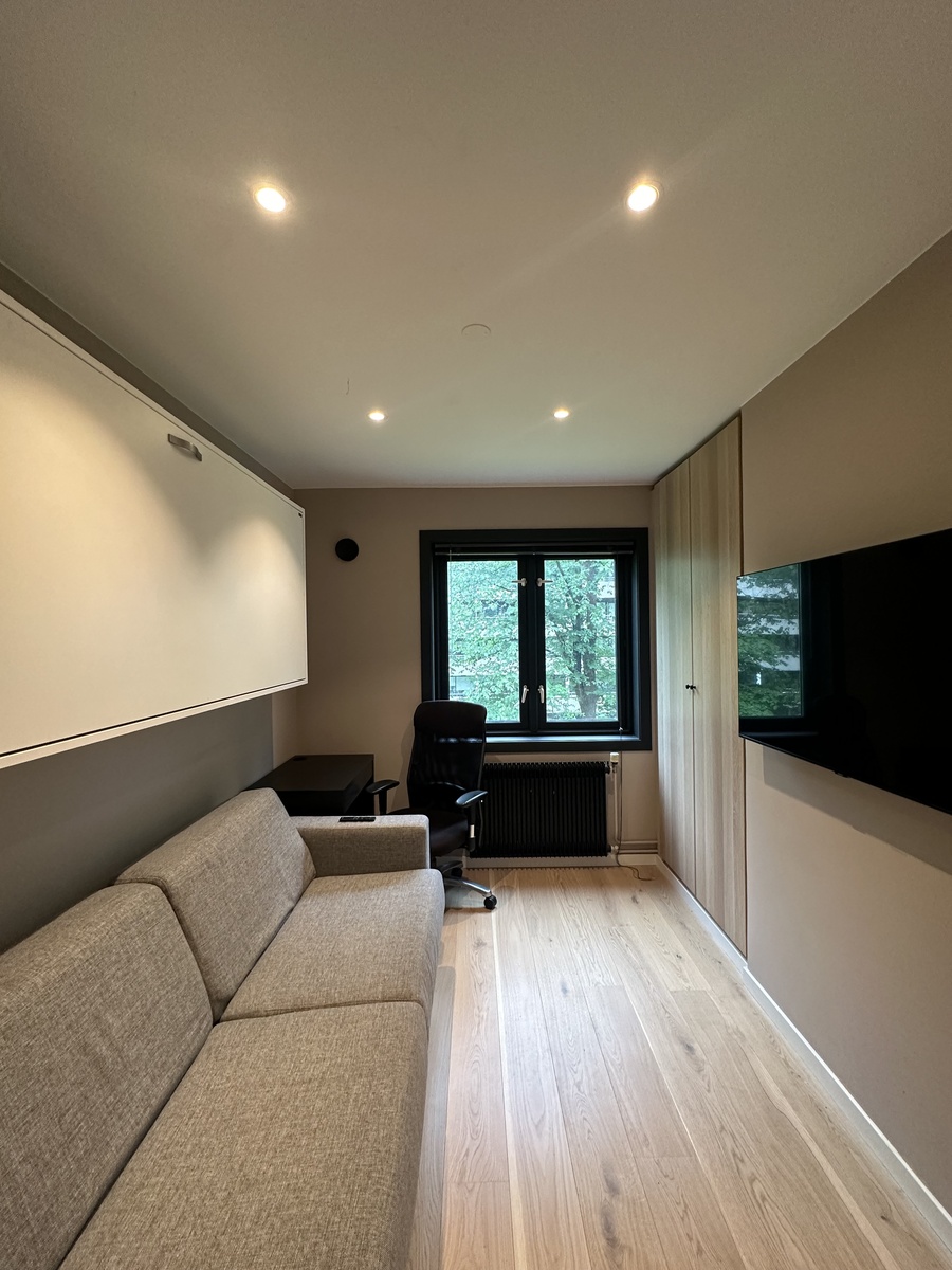 Rommet er fullt møblert med vegghengt skapseng, sovesofa, garderobeskap og TV. Leiligheten ble totalrenovert i 2022 og holder god standard. Bildene i annonsen er tatt med vidvinkel på iPhone.