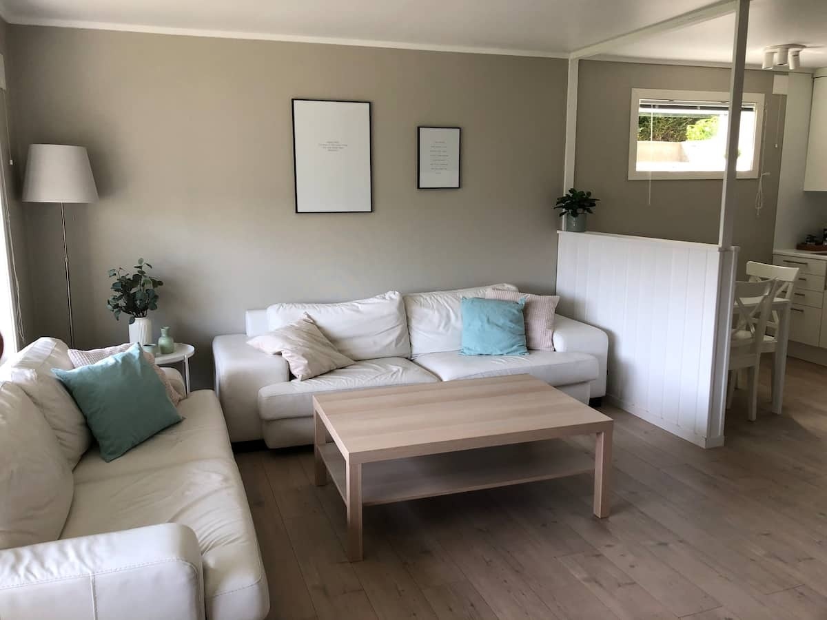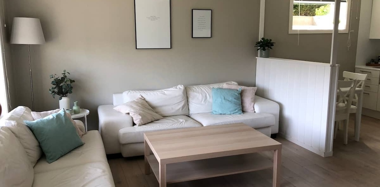 Det er ikke eget soverom, men er en sovealkove. Her er det 120cm seng og eget lite nattbord. Leilighet er delvis separert fra hagen (sees på bilde) slik at du som leietaker kan gå fritt uten innsyn.