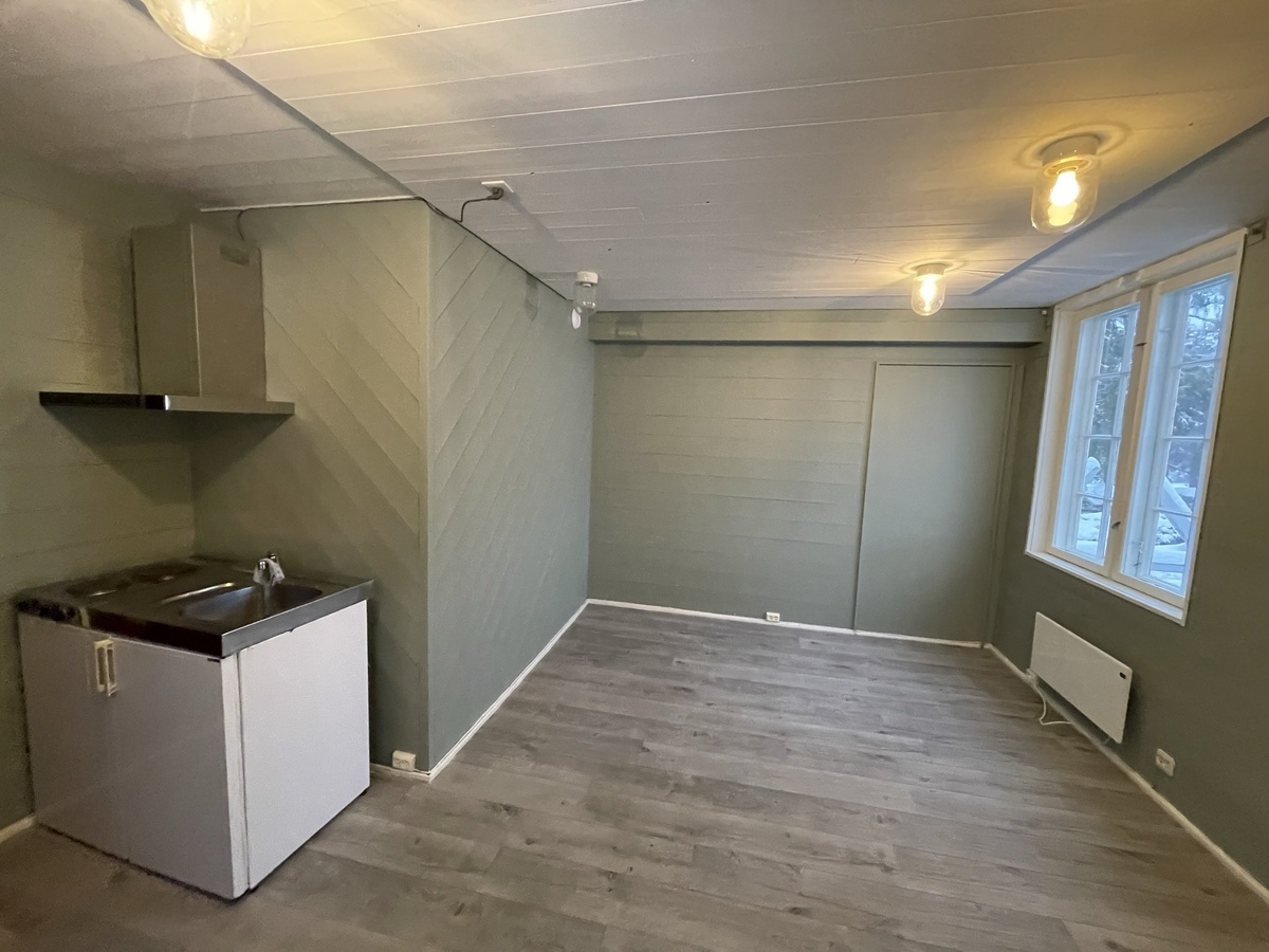 Rommet er på 18 kvm og har et lite praktisk hybelkjøkken.