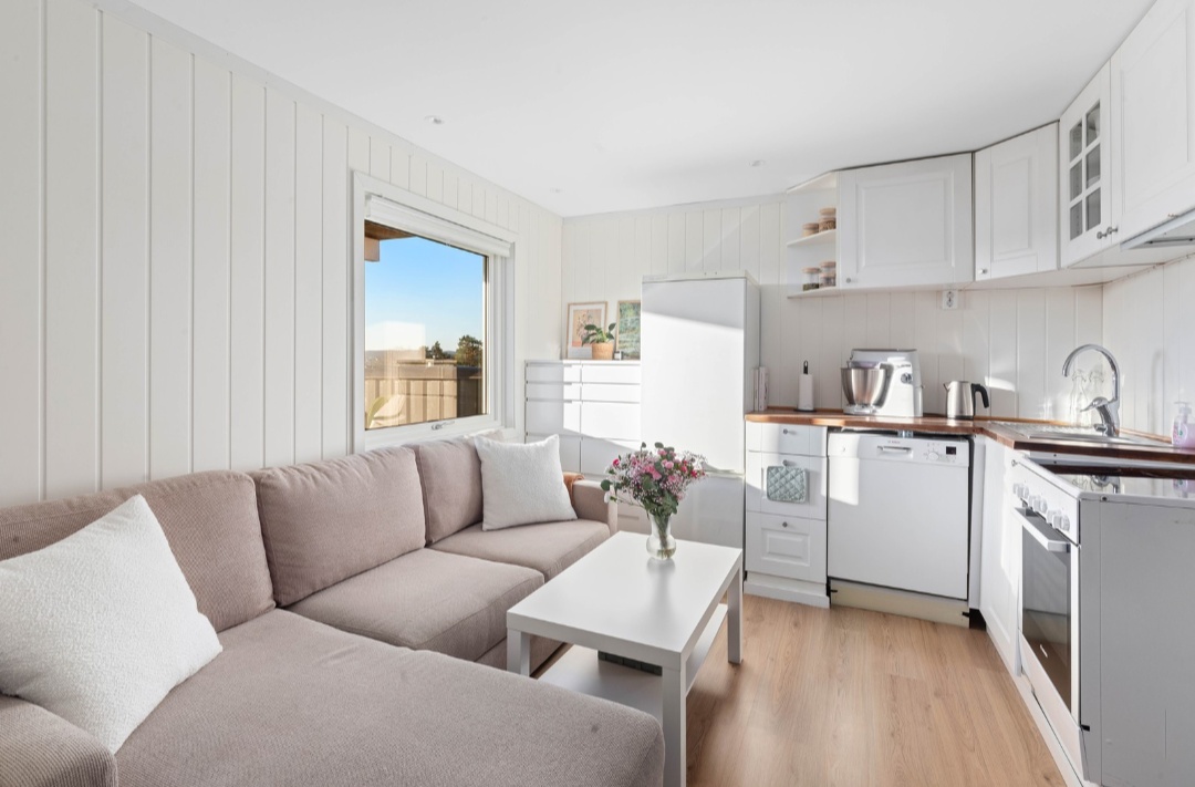 Dobbelseng, kjøkken med hvitevarer og vaskemaskin på badet. Kan følge med en sovesofa som står i stua nå (ikke den på bildene). Tilgang på uteområde.