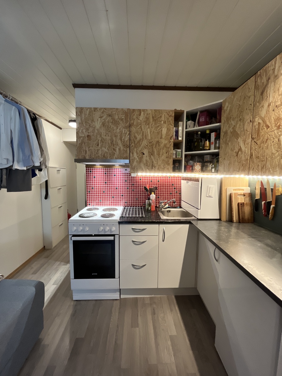 Ettromsleiligheten har sovealkove, samt eget kjøkken og bad. I tillegg er leiligheten utstyrt med en liten oppvaskmaskin, som gjør hverdagen litt enklere. Sameiet har felles vaskerom, med både vaskemaskin og tørketrommel tilgjengelig for leietaker.