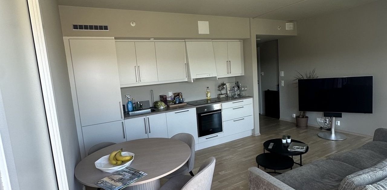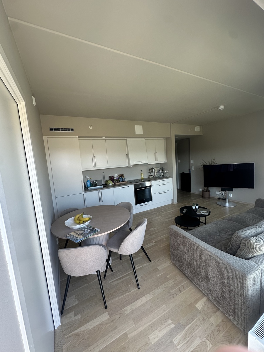 En moderne og fullt innredet 3-roms leilighet i 7. etasje på Lilleby, bygget i 2018. Leiligheten er på 44 m² og har en romslig balkong med fin utsikt.
