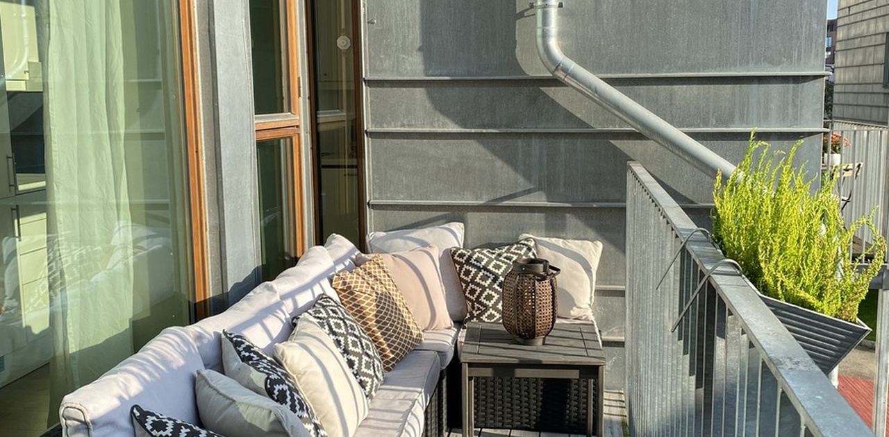 Stue med utgang til stor, vestvendt balkong med sittegruppe (10m2)