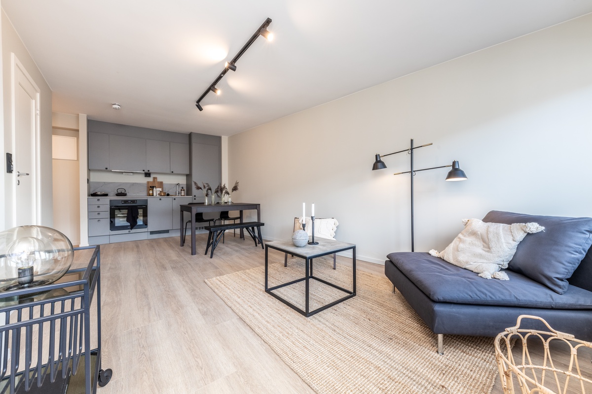 Entrè, bad, 1 soverom, stue med åpen kjøkkenløsning og utgang til balkong.