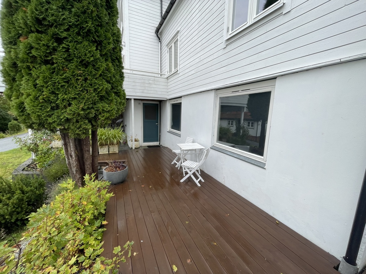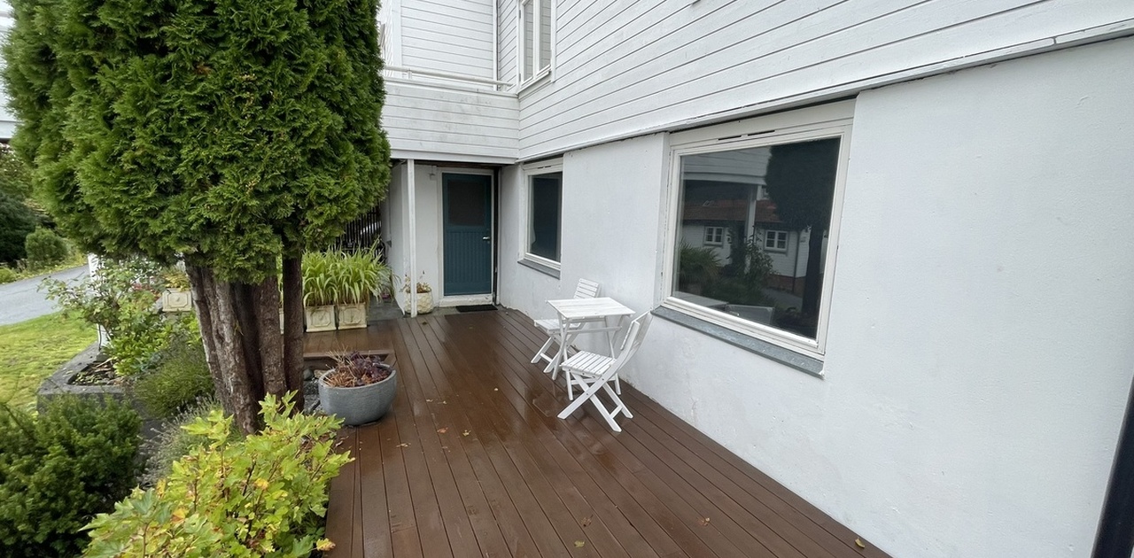 Platting utenfor hybelleiligheten med et lite bord/stoler. Denne kan brukes av leietaker, men vi som bor i huset (jeg og to ungdommer) passerer over plattingen som tilkomst til huset.