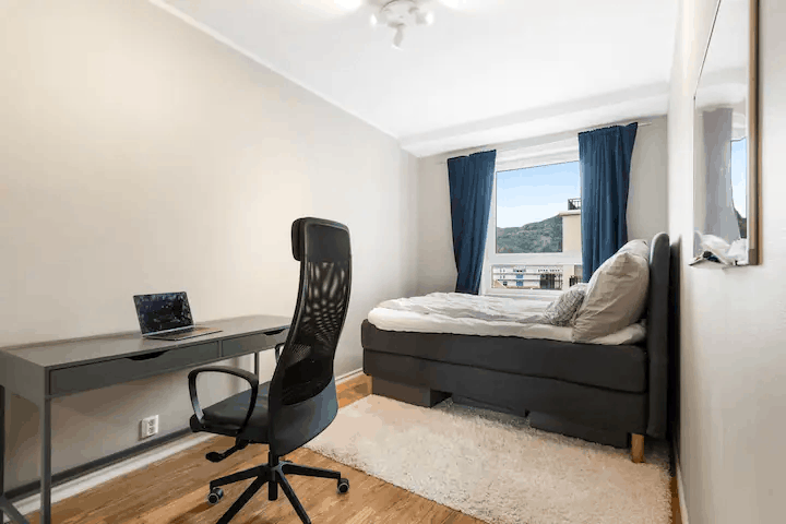 Jeg leier ut ett soverom (soverom 2 på bildene) i en moderne og rolig leilighet med god beliggenhet. Rema 1000 ligger i samme bygg, og Kiwi rett ved siden av.