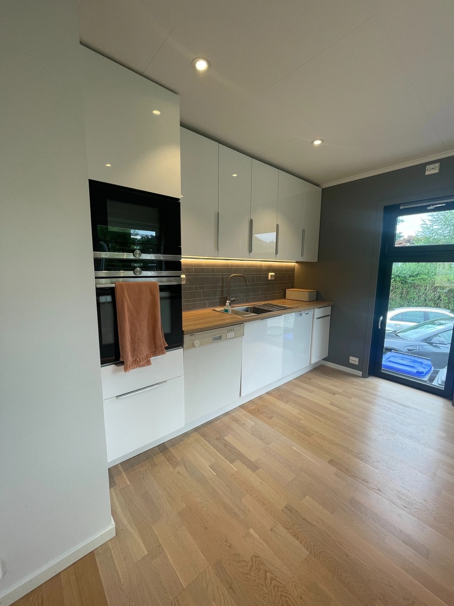 Romslig stue og kjøkken: Åpen løsning med mye naturlig lys, ideelt for sosiale sammenkomster. Kjøkkenet ligger i en moderne tosidig løsning med hvitevarer som stekeovn, mikrobølgeovn, koketopp, kjøleskap og to oppvaskmaskiner.