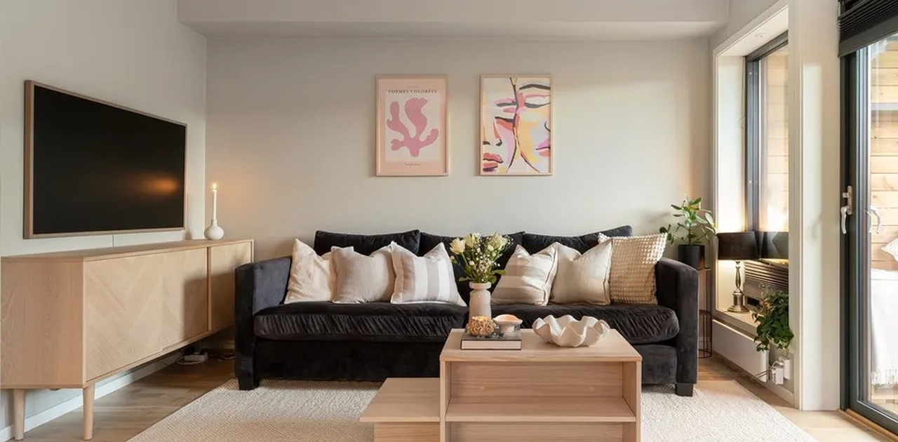 Leiligheten leies ut møblert (bl.a. sofa, TV [Samsung 55" The Frame 4K QLED Smart TV] stuebord, seng (180), nattbord, skap/oppbevaringsmuligheter, hvitevarer) og nødvendig kjøkkenredskaper. Gulvet er parkett. Leilighetene har balansert