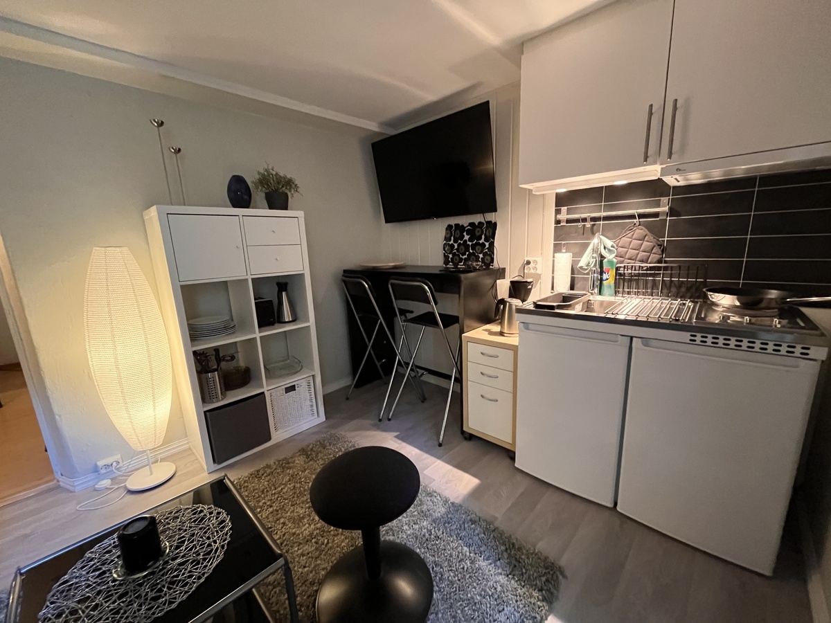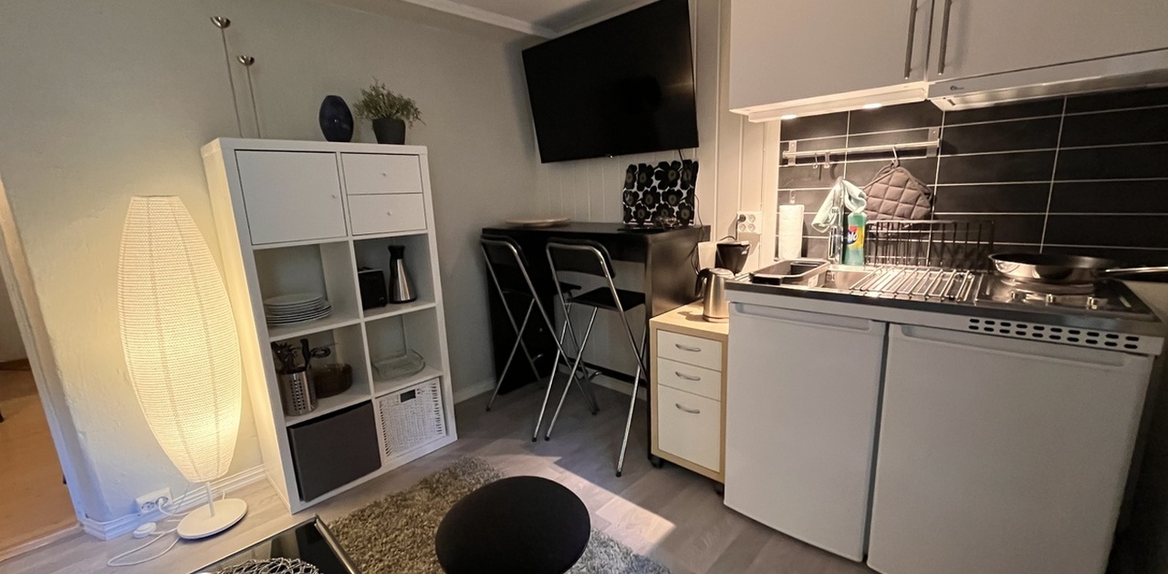 Kjøleskap med liten fryseboks. 50 tommers Tv med Strim. Wifi. 120 seng. Skrivebord. Vaskemaskin. Mye oppbevaringsplass. Garderobeskap. Bod.