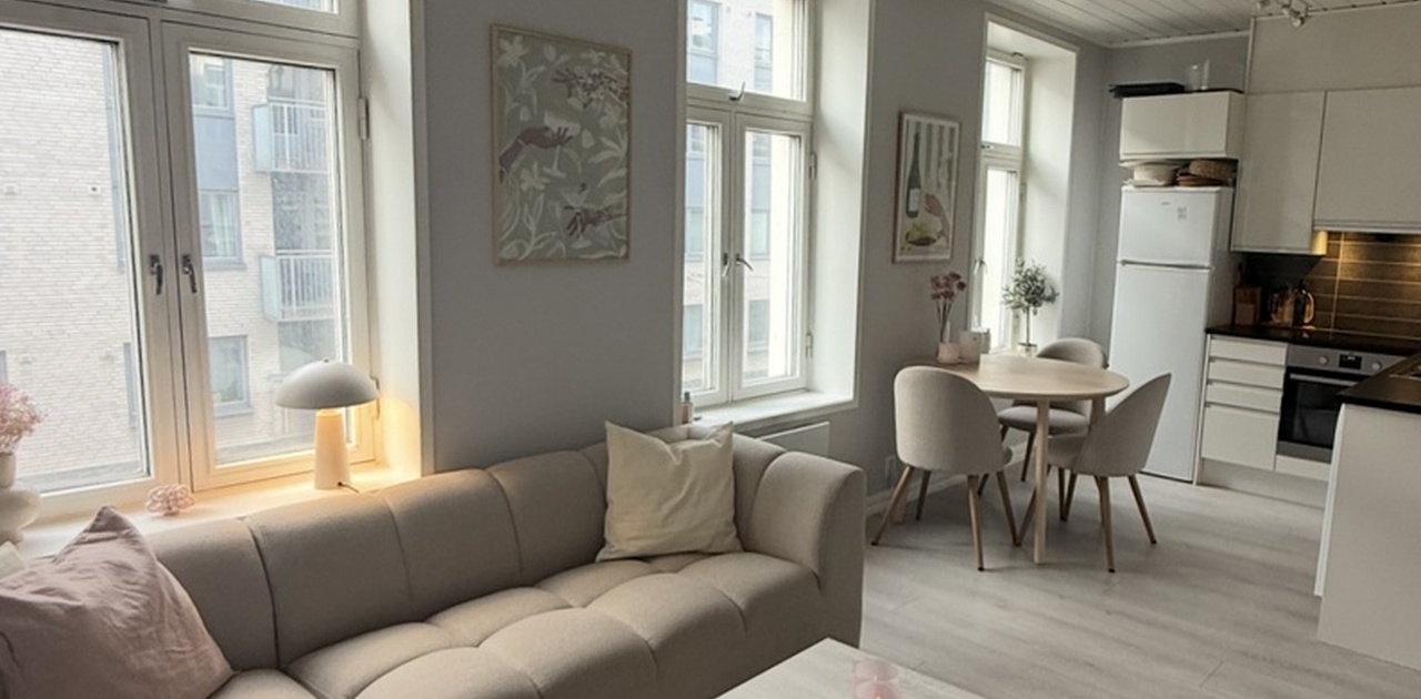 Leiligheten leies ut møblert, og hvitevarer (kjøleskap, oppvaskmaskin, komfyr og vaskemaskin) er inkludert. De øvrige møblene har vi selv kjøpt inn, så tanken er at den nye leietakeren betaler seg inn i møblene som allerede er på plass.
