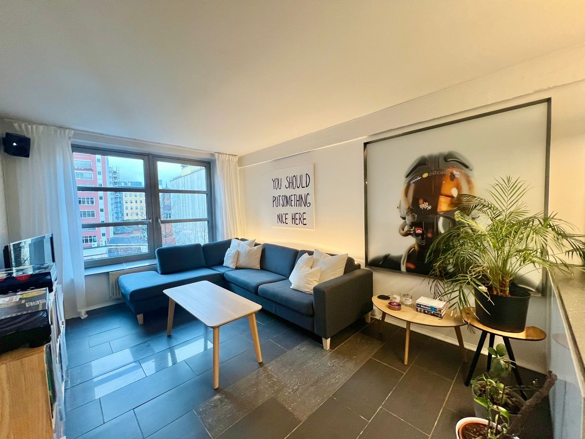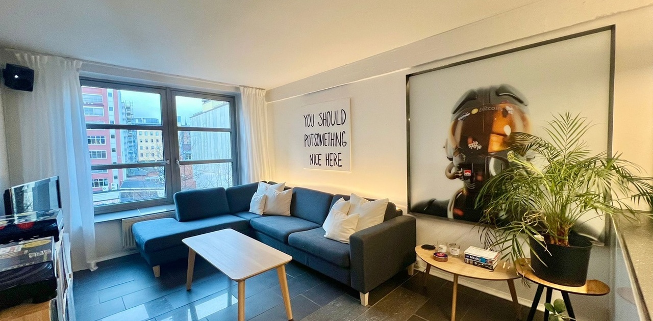 Leiligheten: Med sine 65 kvm har leiligheten et moderne og luftig design, inkludert et åpent kjøkken, romslig stue, spiseområde og eget bad. Soverommet ligger bak en praktisk skyvedør, noe som gir en ekstra følelse av privatliv i et ellers åpent rom. Her finner du også praktiske fasiliteter som Apple TV, et fullt utstyrt DJ-set up for vinylentusiaster, og et velutstyrt kjøkken.