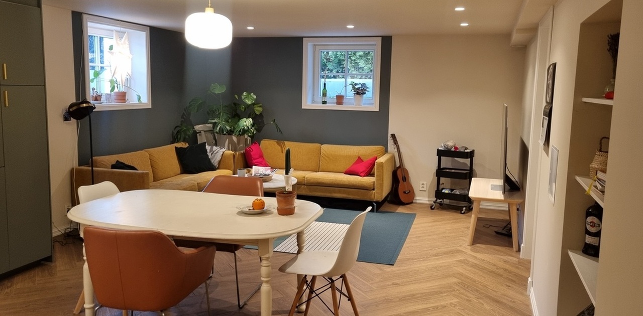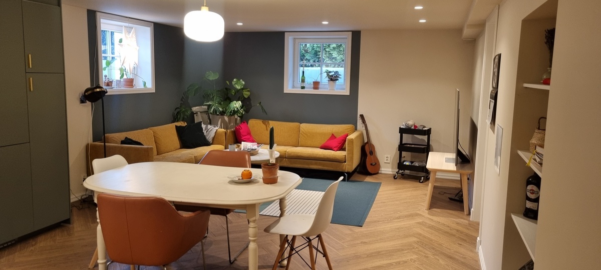 Helt ny leilighet med to soverom og totalareal på 65 kvm. Ventilasjonssystem, vannbåren gulvvarme, oppvaskmaskin, vaskemaskin, mikrobølgeovn og alt annet som trengs. Også en piano! :-) Takhøyde er ganske bra og det er veldig lys og koselig for en hybel. Huseier bor oppe og er veldig hyggelig.