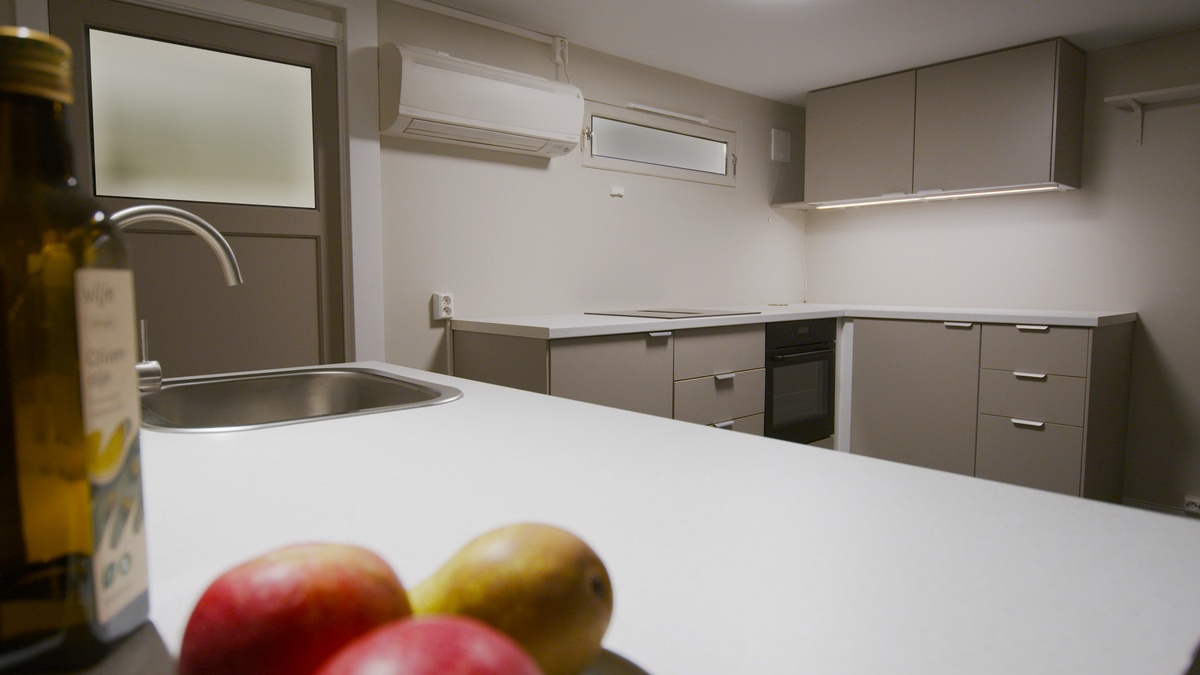 Den har en åpen løsning mellom kjøkken og stue. Hybelen har også et bad som dekker alle grunnleggende behov.