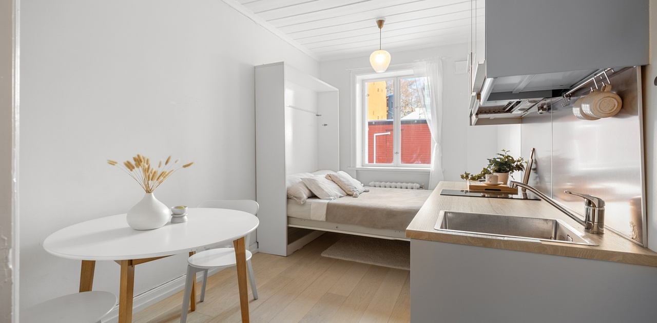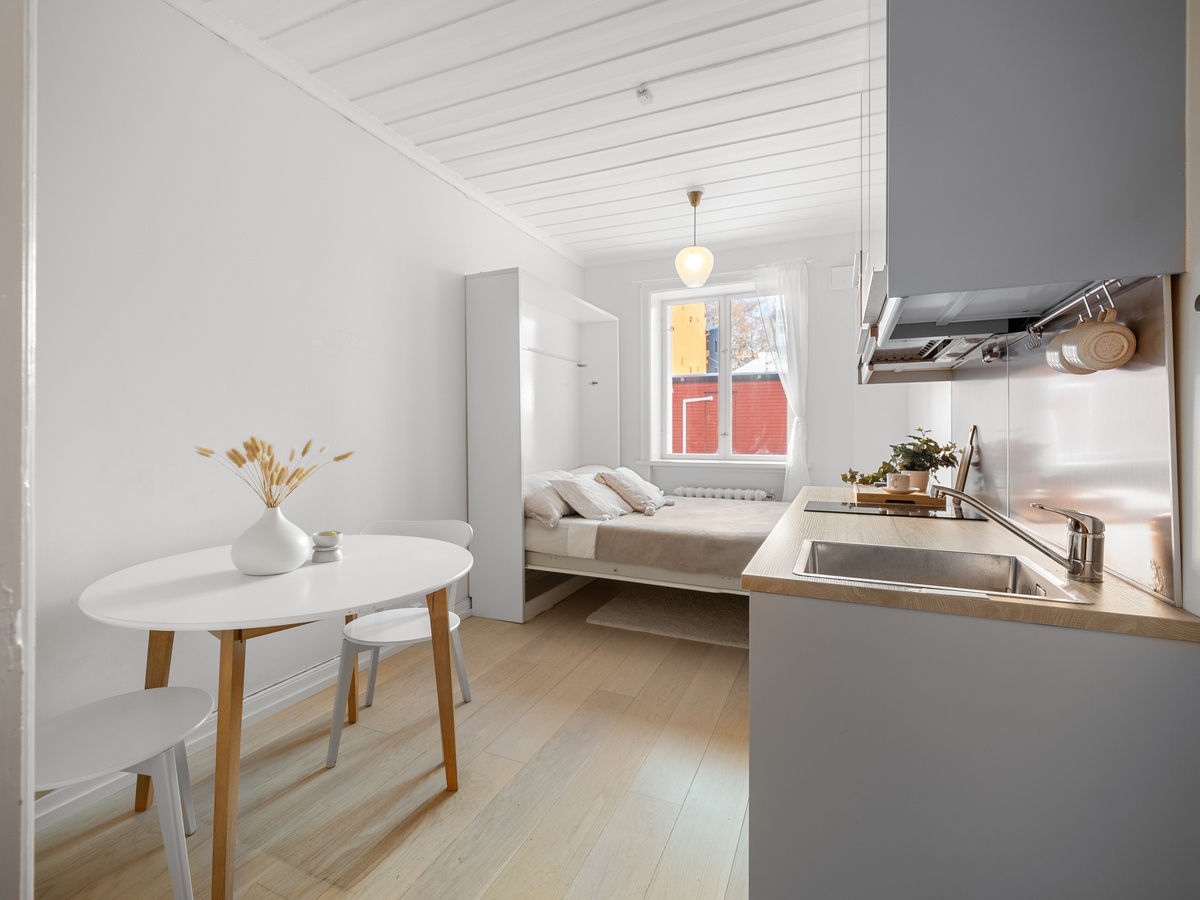 Leiligheten består av entré, stue, kjøkken og et lite kott. Store vindusflater gir godt med lys, og takhøyden er generøse 2,80 meter. Felles fasiliteter inkluderer balkonger, bibliotek, WC-rom, bad og vaskeri i kjelleren (gratis bruk). Oppvarming, varmtvann, internett og kabel-TV er inkludert i leien.