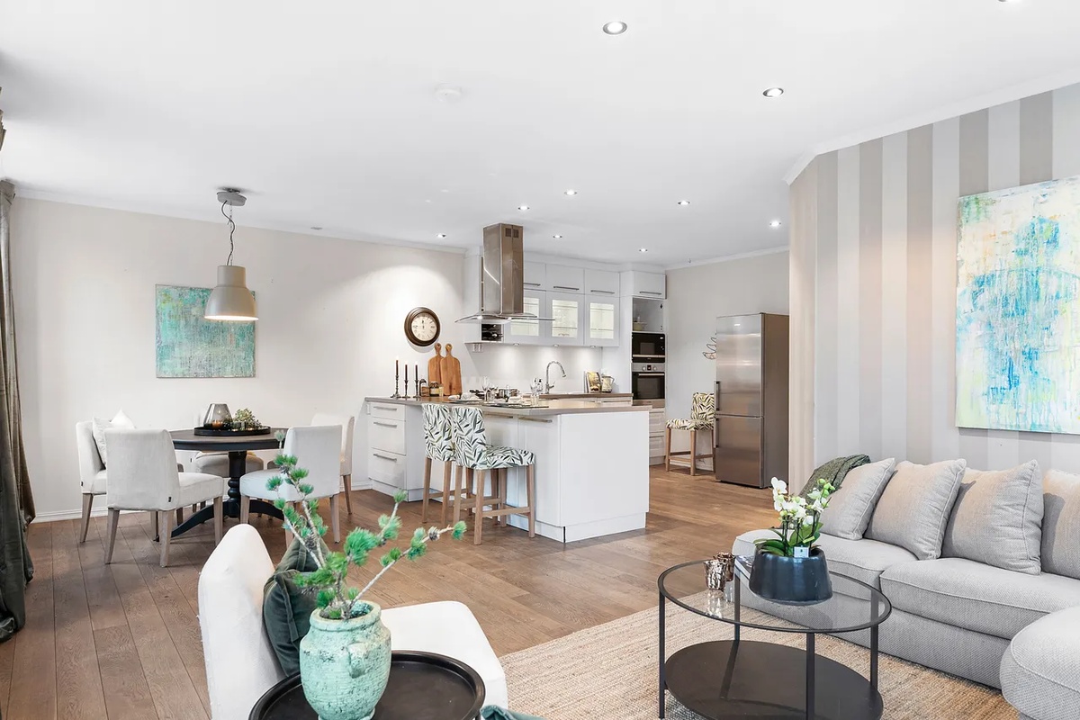 Leiligheten er pusset opp etter at bildene ble tatt, med en forbedret romløsning som gir lys, luft og god plassutnyttelse. Møblementet er i hovedsak det samme som vist på bildene, med unntak av at spisebordet er erstattet med et langbord i eik. Det er også installert ny, stor flatskjerm-TV og gode senger som gir komfortabel nattesøvn.