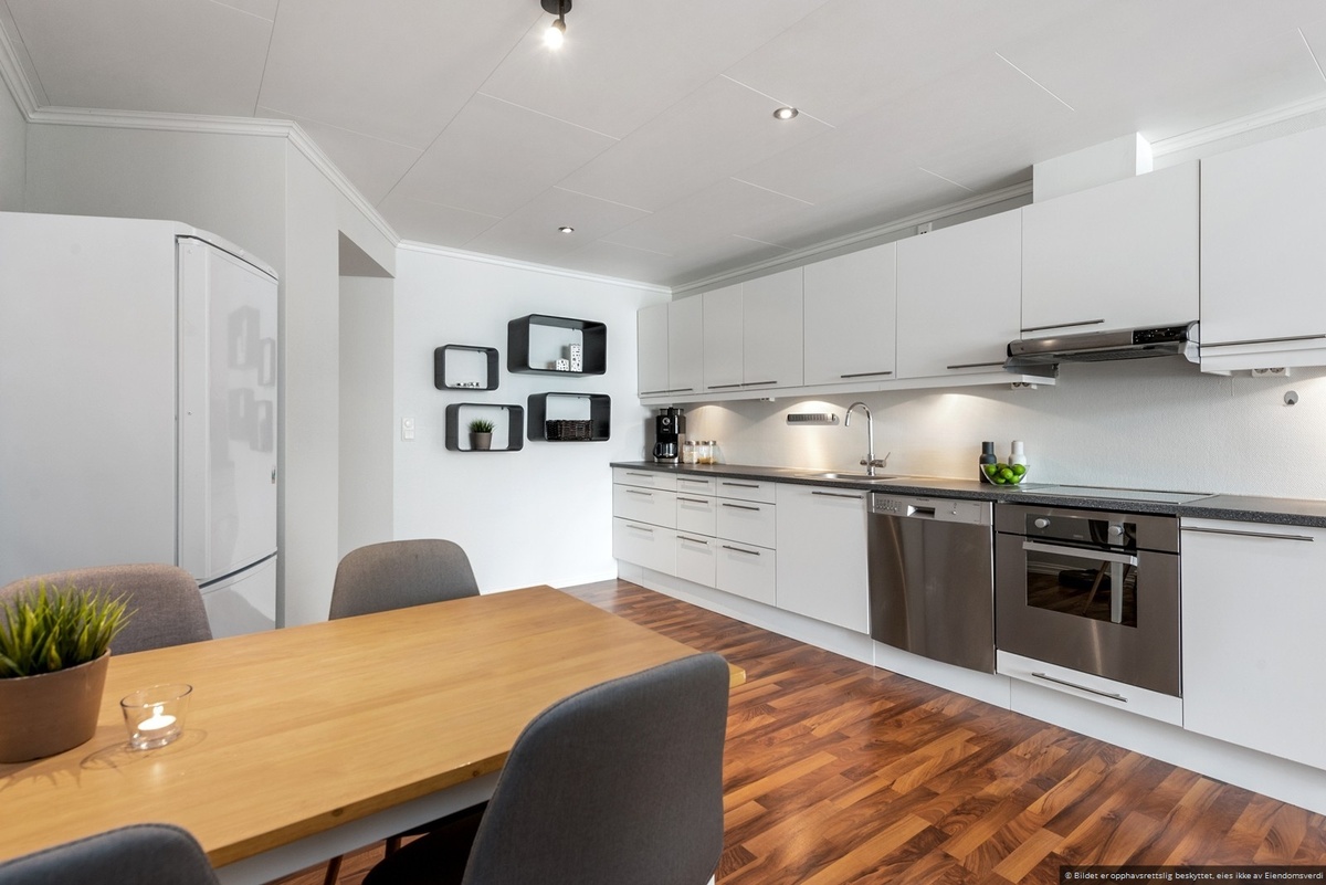 1 soverom, 1 bad og romslig kjøkken med god skapplass.